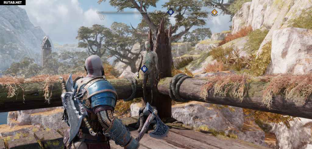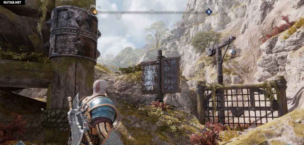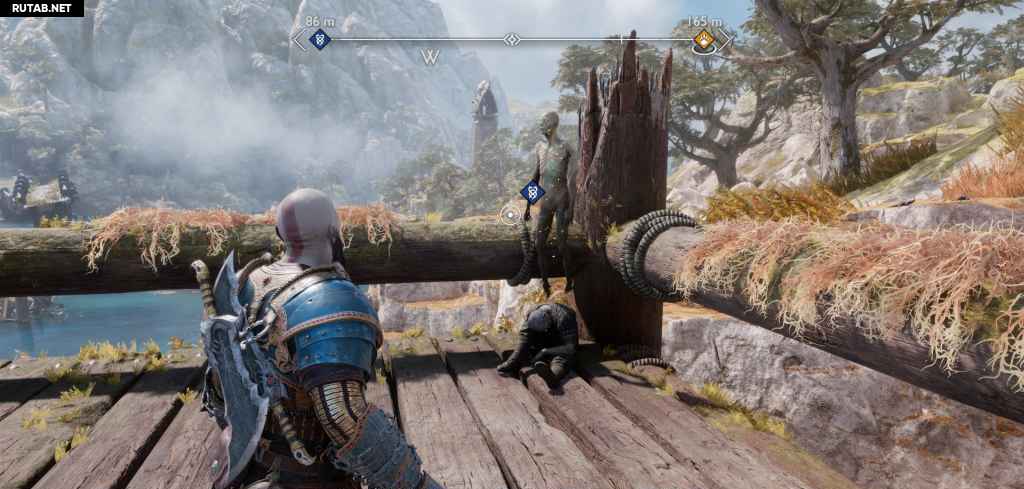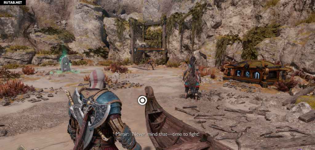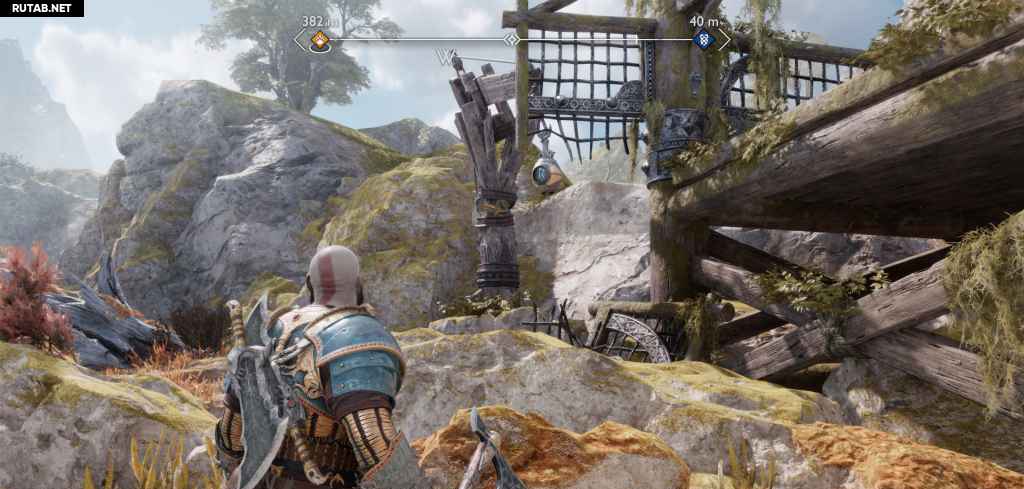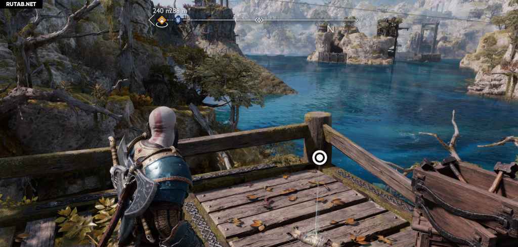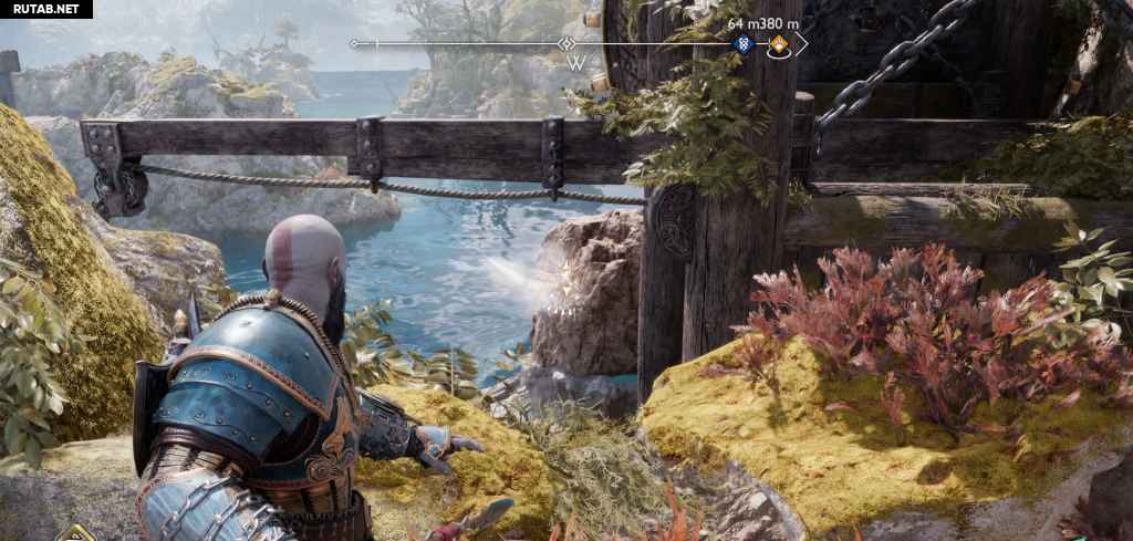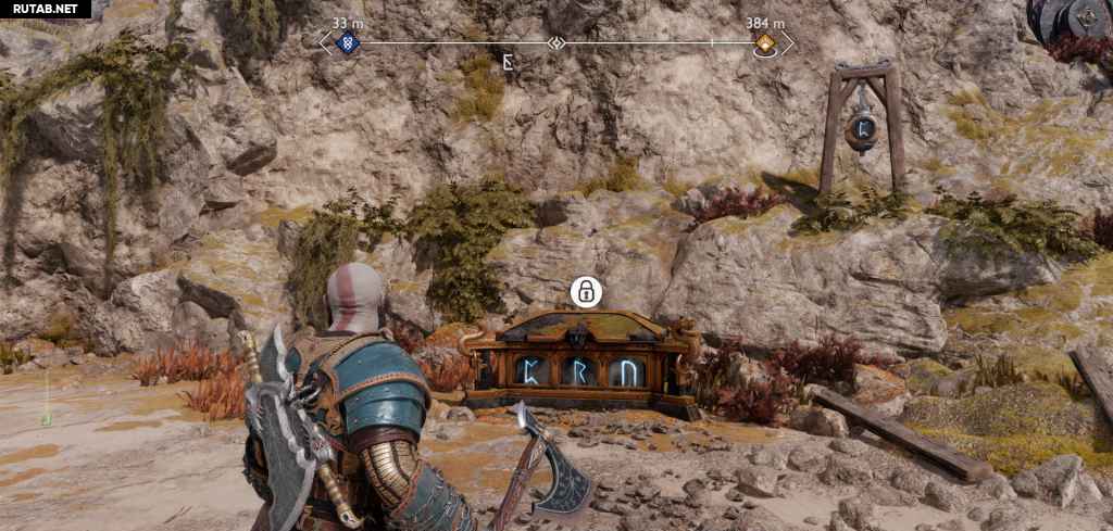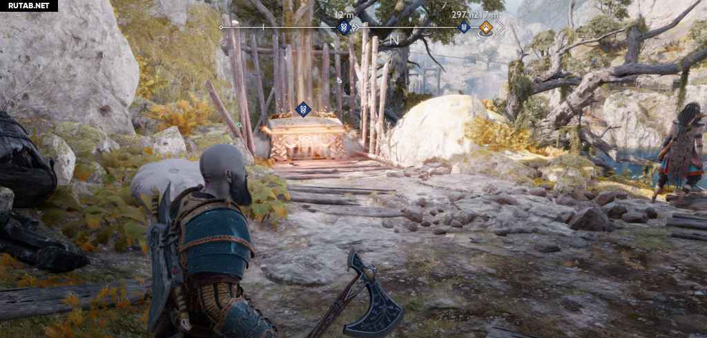 На берегу будет сундук Норн, который можно открыть, позвонив в колокольчики. Один находится рядом с сундуком, один висит на кране слева, а третий находится за ограждением, и его можно поднять, бросив топор в объект слева.