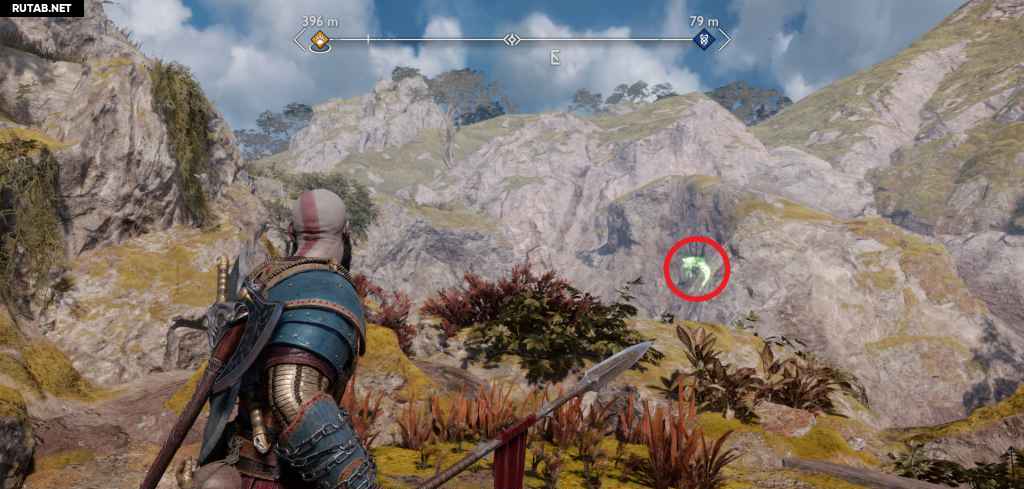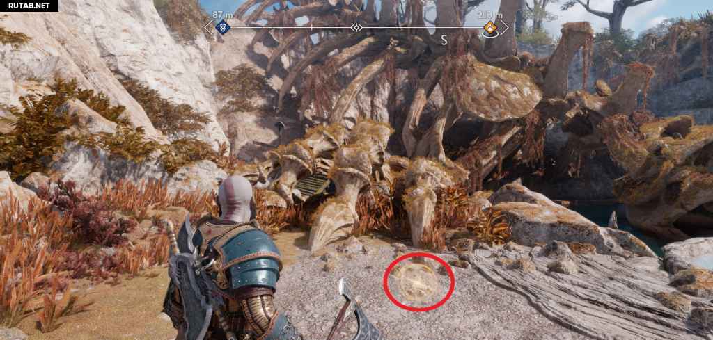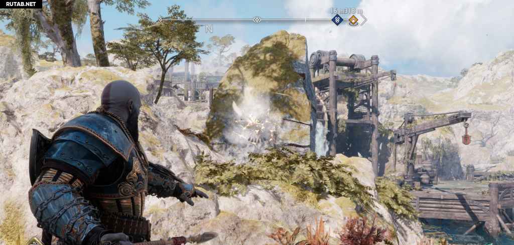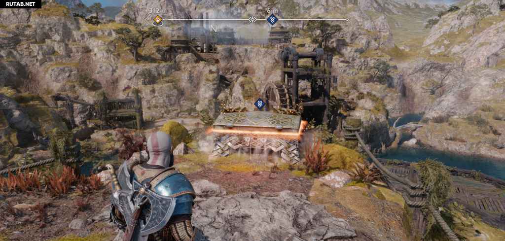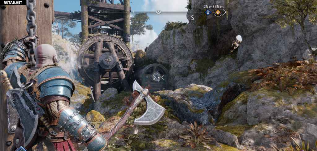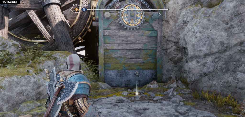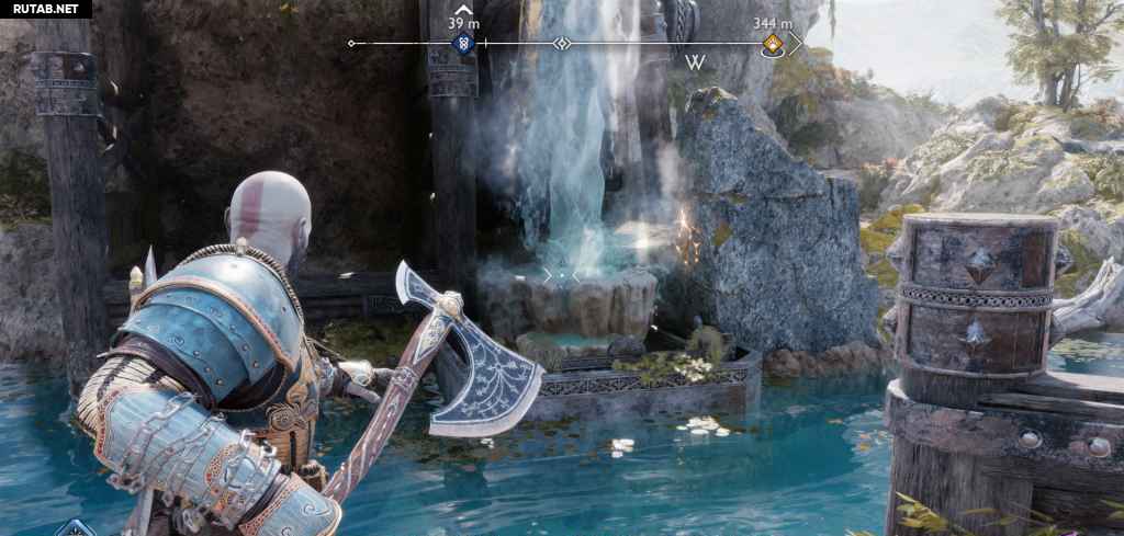 Идите вперед и разбейте звуковой камень слева, затем убейте Ворона Одина, летящего над водой. Спуститесь и посмотрите на водяное колесо, чтобы увидеть камень, который вы можете разрушить своим копьем.