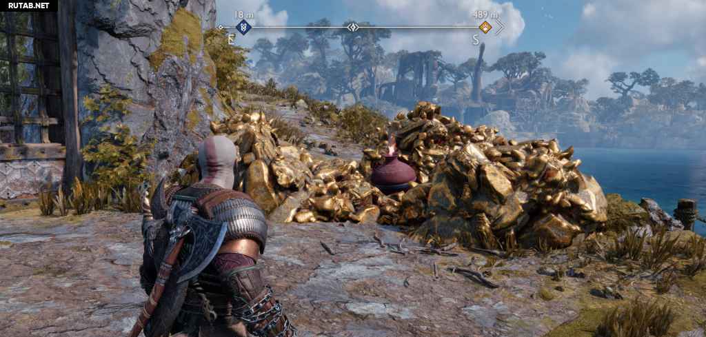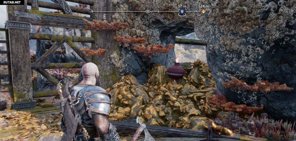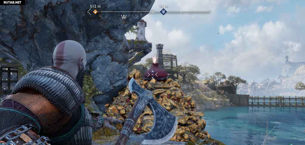 Разрушьте камни, бросив топор в огненный корабль, затем уничтожьте гнездо. Продолжайте двигаться вперед к другому огненному кораблю, который вы можете уничтожить, затем проскользните вдоль стены.