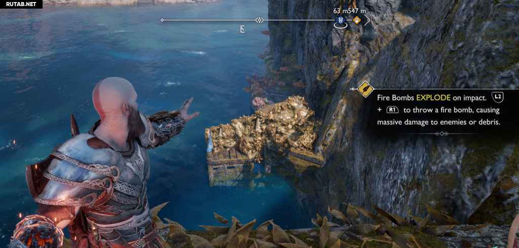 Прежде чем вернуться к лодке, возьмите еще одну зажигательную бомбу и поднимитесь по первому пути, который вы открыли, и уничтожьте там камни. Затем перевернитесь и проползите через дыру, чтобы найти Ворона Одина.
