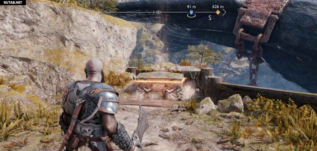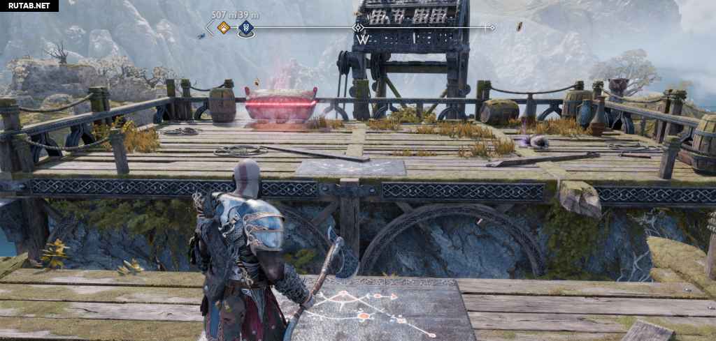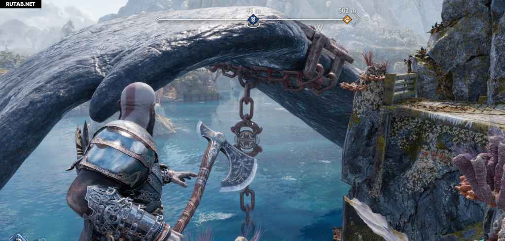 Поднимитесь по цепям и разберитесь с драуграми. Уничтожьте огненный сосуд, чтобы открыть путь и разорвать оковы, затем бросьте свой топор в цепь.