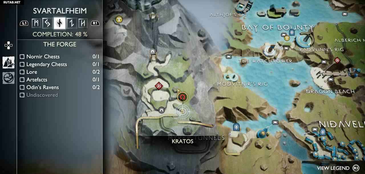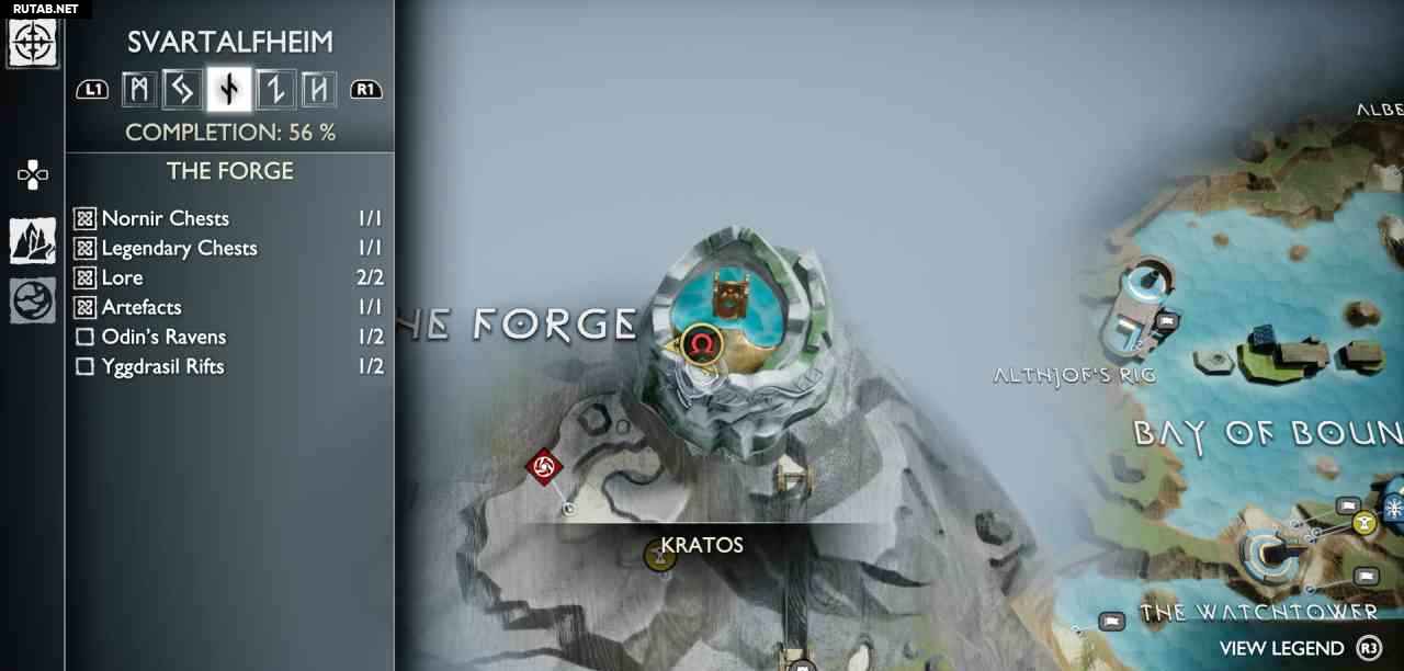 Чтобы вернуться в Кузницу после сюжета, быстро отправляйтесь к Таинственным Вратам Свартальфхейм >Побережье Нидавеллир (автоматическая разблокировка сюжета). Оттуда поднимитесь на холм, ведущий в район Кузницы. После поездки справа будет летать ворон. Он всегда летит по одному и тому же пути кругами. Встаньте так, чтобы смотреть на него, когда он летит в вашем направлении, и бросьте свой топор, чтобы поразить его в воздухе.