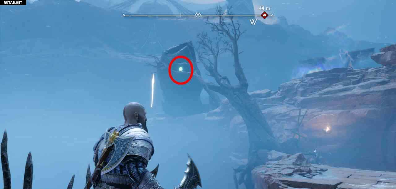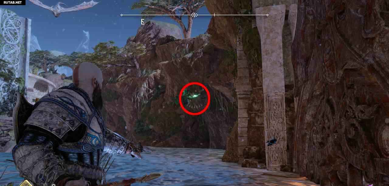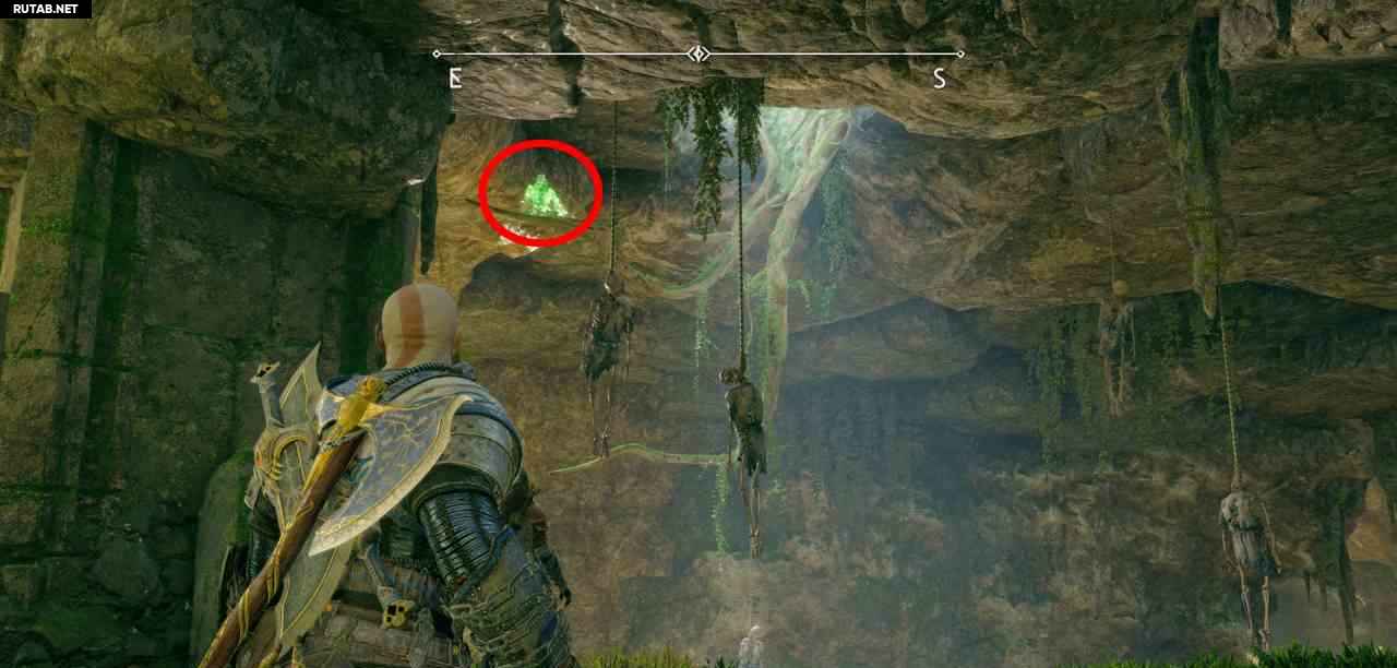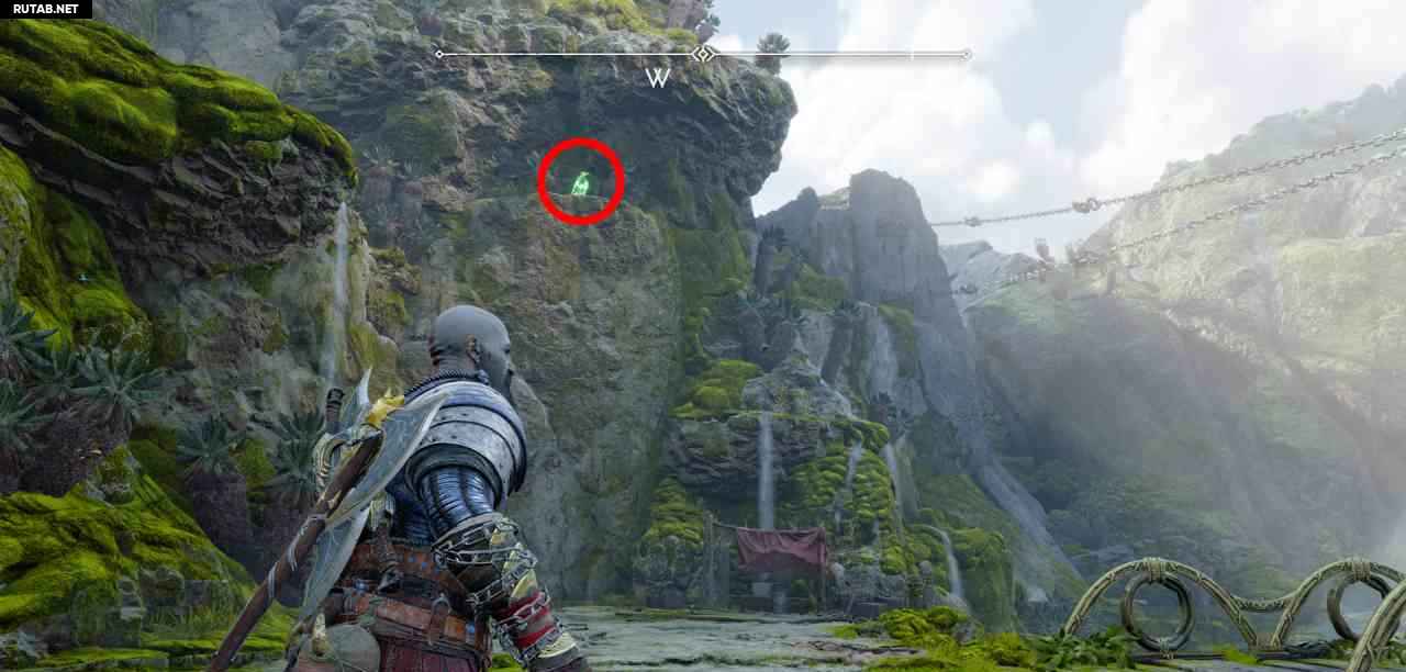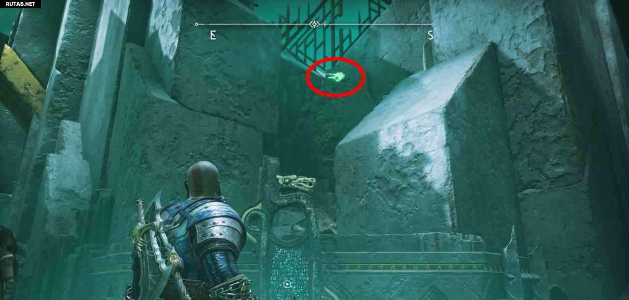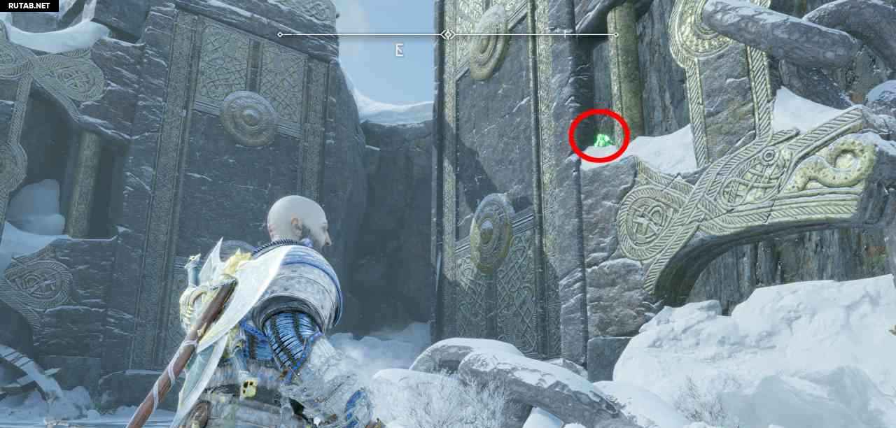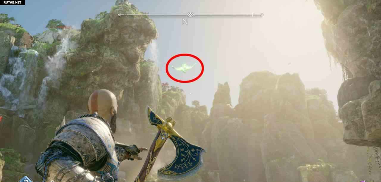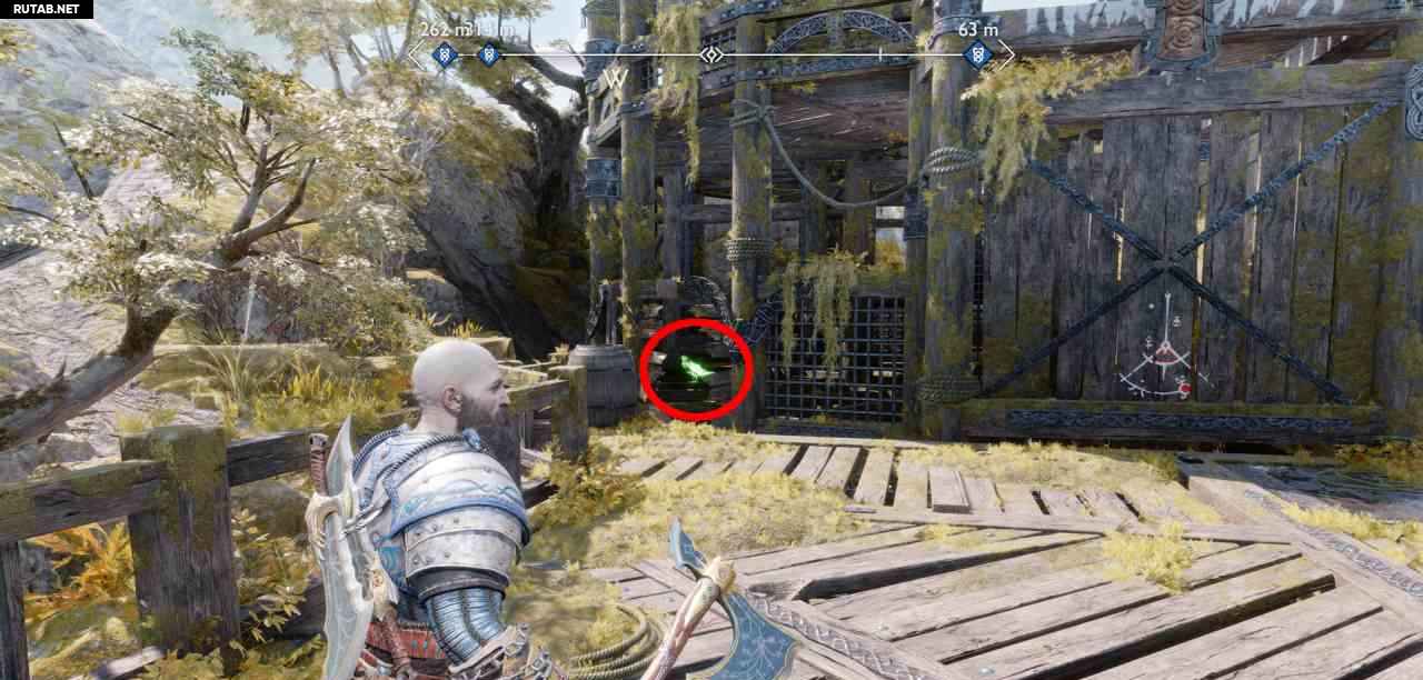 В первой комнате убейте врагов и пока игнорируйте сундук Норн. Поднимитесь по стене за сундуком Норн, затем убейте следующую группу врагов и поднимитесь по золотой цепи. Спрыгните с другой стороны, чтобы найти большую цепь, которую вы должны потянуть, это откроет весь регион, чтобы захватить другие предметы коллекционирования. С того места, где вы тянете эту большую цепь, вы можете увидеть ворона, сидящего на скалах рядом с большой статуей викинга. Легче попасть, если вы подниметесь по тропинке, откуда пришли, а затем бросите топор оттуда.