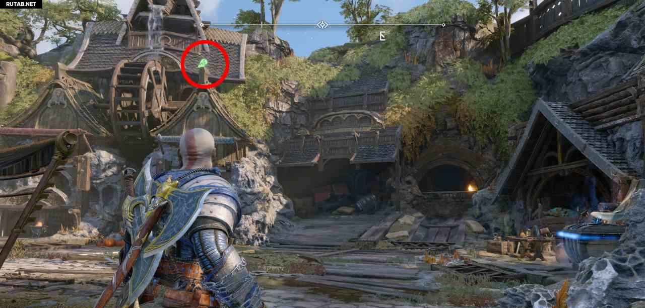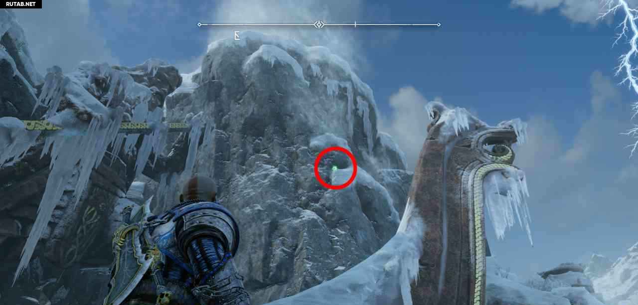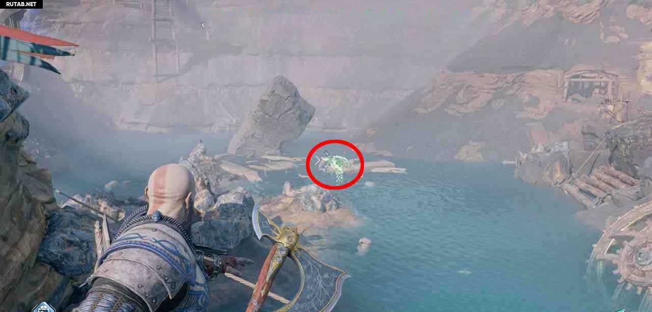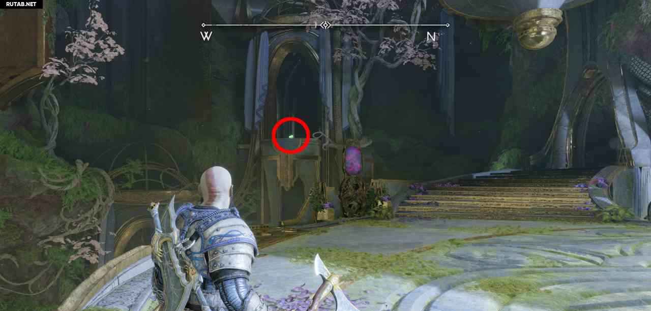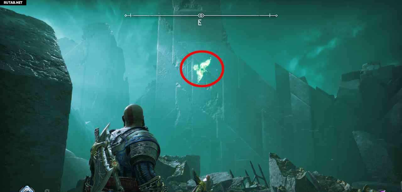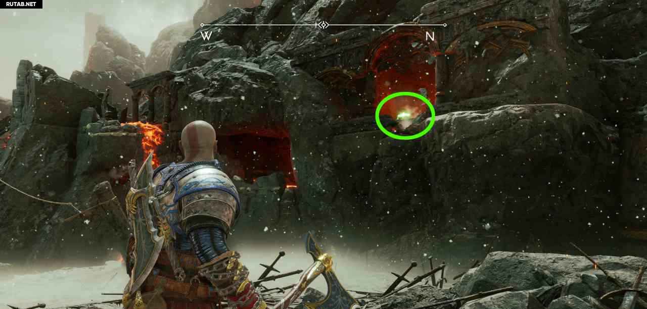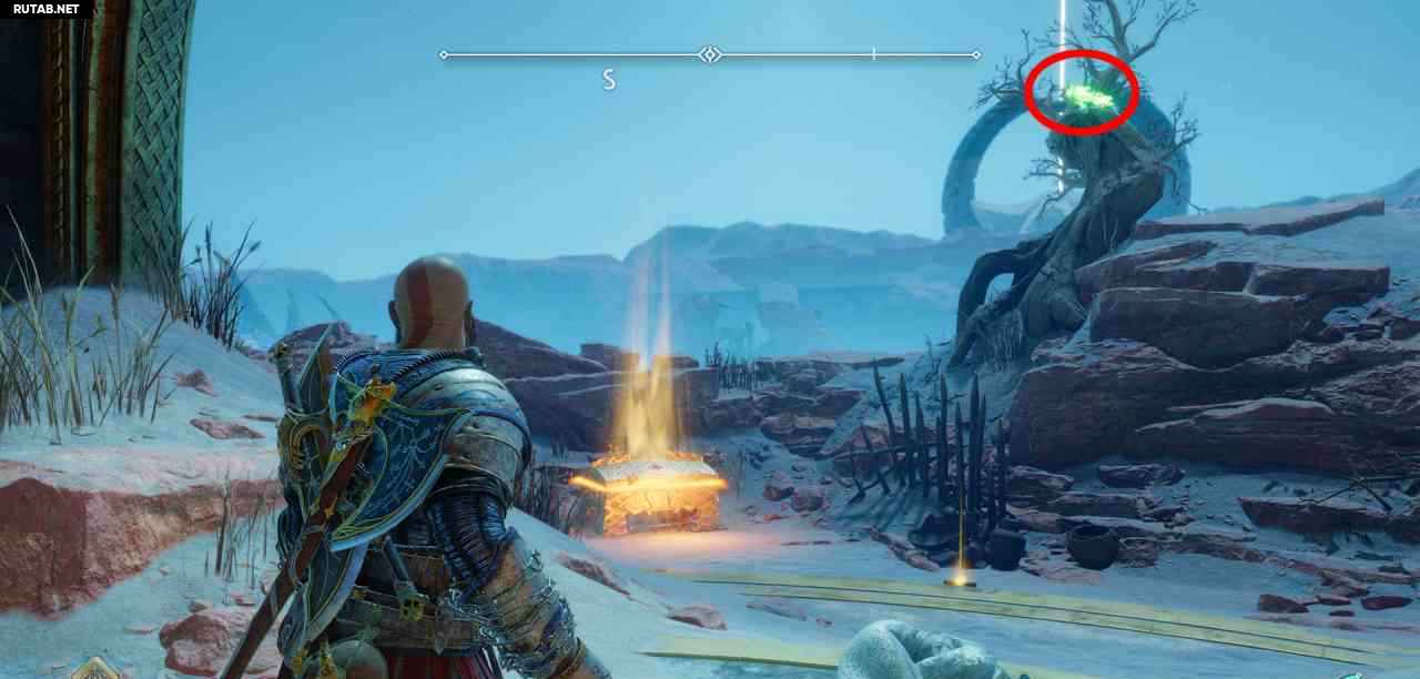 В первой комнате убейте врагов и пока игнорируйте сундук Норн. Поднимитесь по стене за сундуком Норн, затем убейте следующую группу врагов и поднимитесь по золотой цепи. Спрыгните с другой стороны, чтобы найти большую цепь, которую вы должны потянуть, это откроет весь регион, чтобы захватить другие предметы коллекционирования. С того места, где вы тянете эту большую цепь, вы можете увидеть ворона, сидящего на скалах рядом с большой статуей викинга. Легче попасть, если вы подниметесь по тропинке, откуда пришли, а затем бросите топор оттуда.