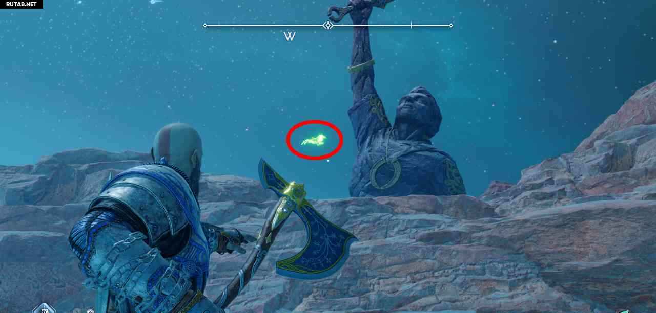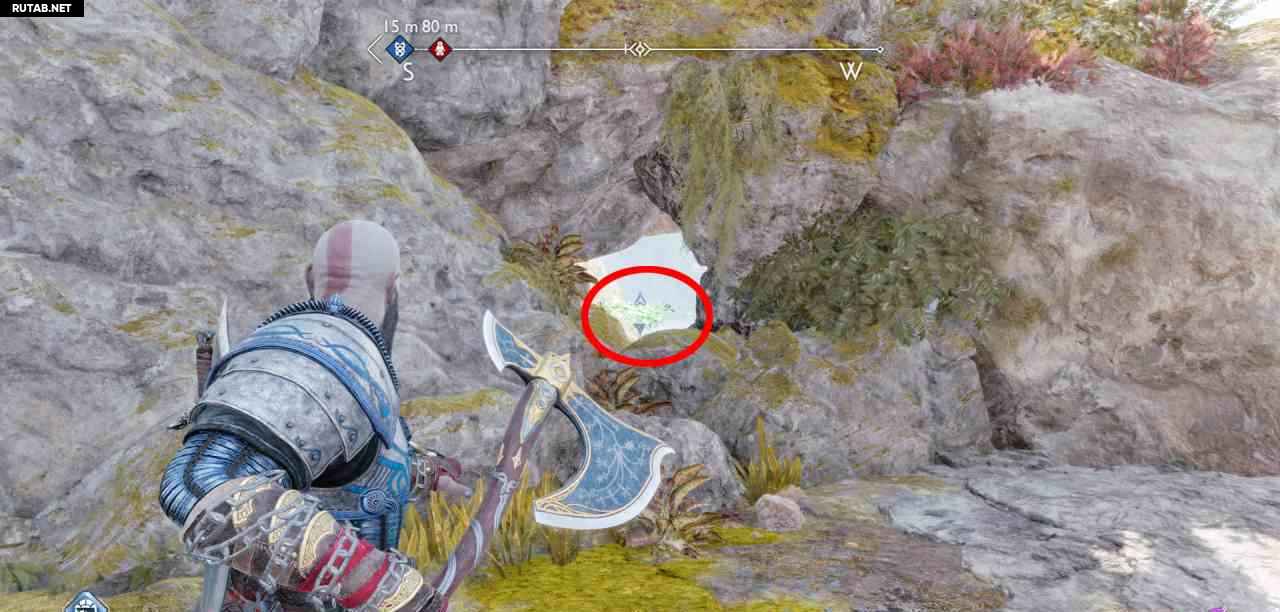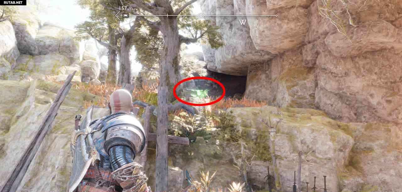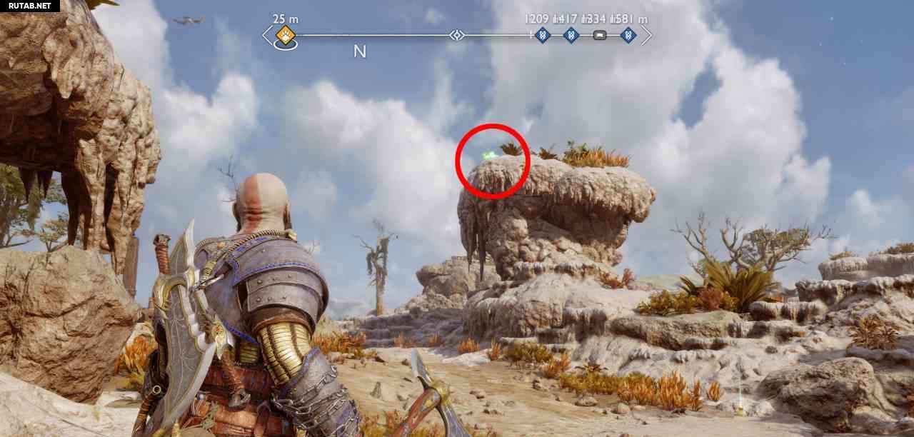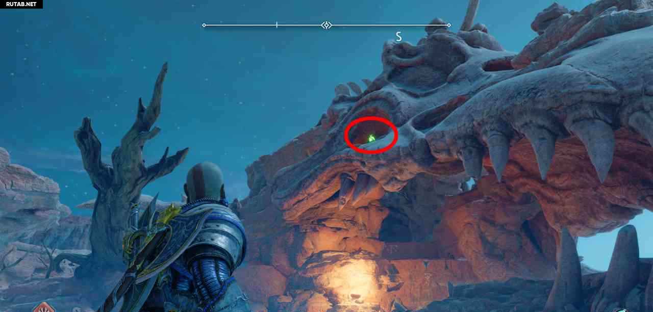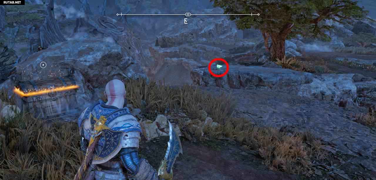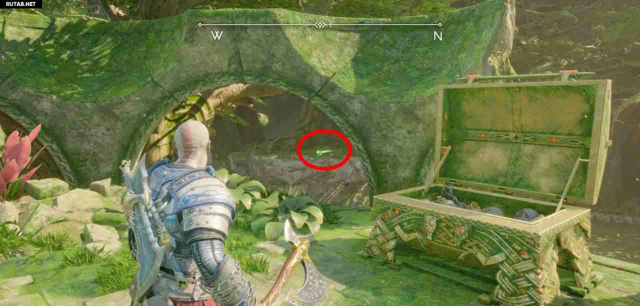 В первой комнате убейте врагов и пока игнорируйте сундук Норн. Поднимитесь по стене за сундуком Норн, затем убейте следующую группу врагов и поднимитесь по золотой цепи. Спрыгните с другой стороны, чтобы найти большую цепь, которую вы должны потянуть, это откроет весь регион, чтобы захватить другие предметы коллекционирования. С того места, где вы тянете эту большую цепь, вы можете увидеть ворона, сидящего на скалах рядом с большой статуей викинга. Легче попасть, если вы подниметесь по тропинке, откуда пришли, а затем бросите топор оттуда.