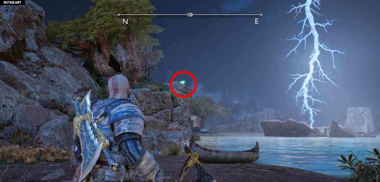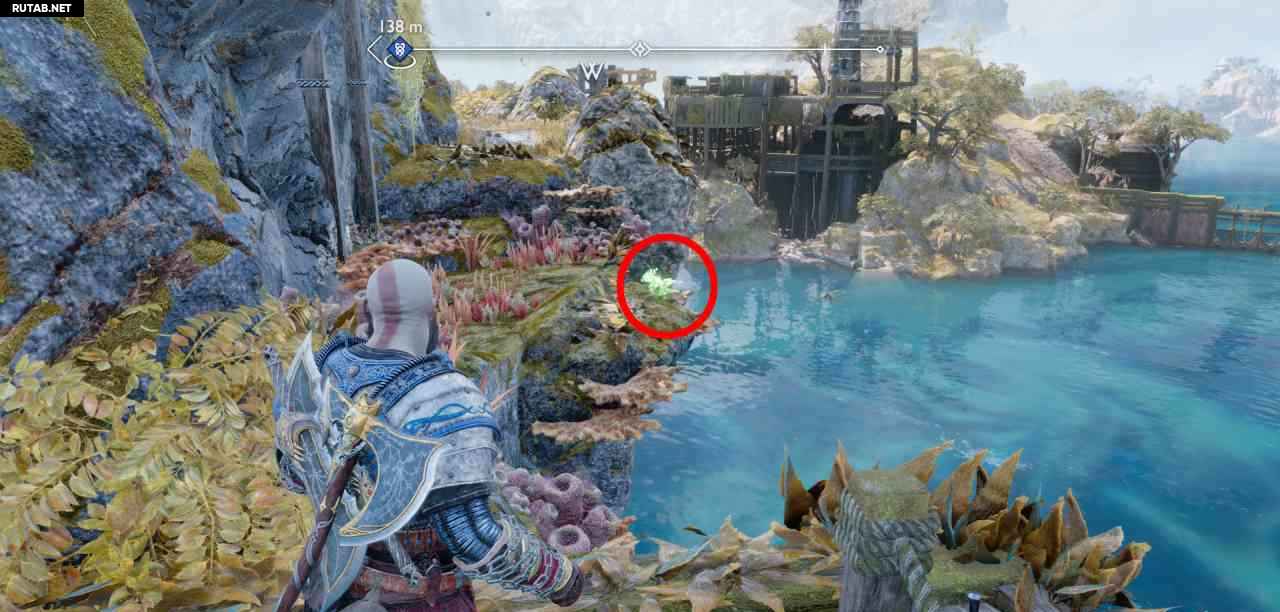 С берега, где вы причаливаете лодку, посмотрите вверх, чтобы увидеть ворона, летящего кругами. Легче попасть после подъема, стоя у красного сундука (но можно попасть и с берега).