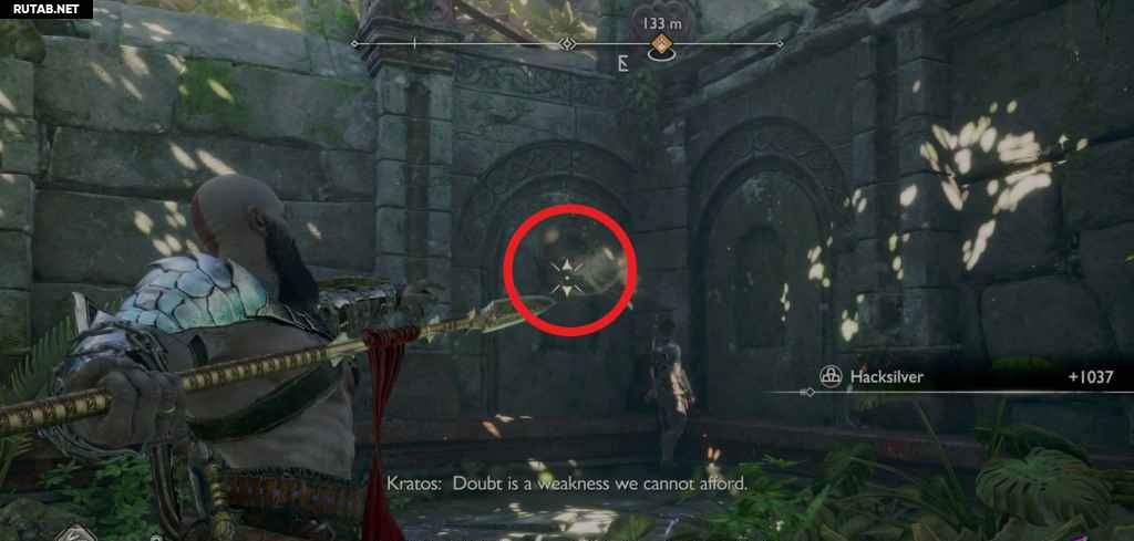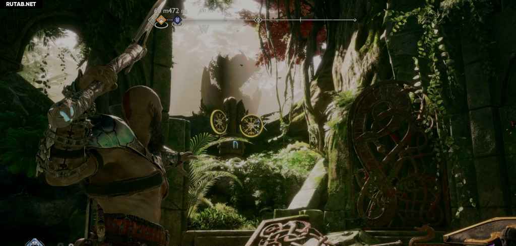 Продолжайте идти по пути, и вы окажетесь в районе, где вы сражались с Нидхёггом. Чтобы продвинуться дальше, посмотрите на левую сторону, где вы можете бросить копье в вентиляционное отверстие, вдоль вас, чтобы продолжить движение к цели.