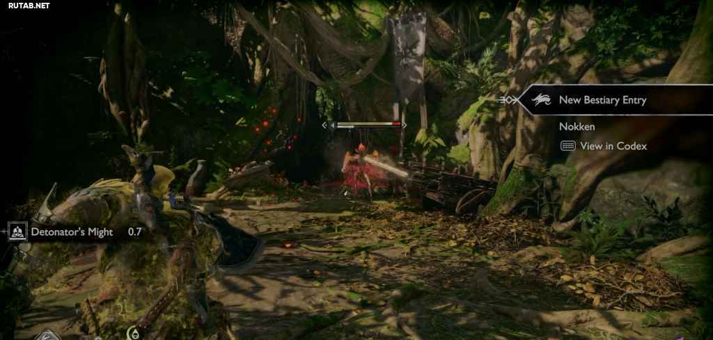 Следуйте по тропинке с другой стороны логова и продолжайте движение дальше в лес. Пройдя два ядовитых растения, вы столкнетесь со своим первым эйнхерием, который блокирует деревянный барьер, который вы можете открыть своими клинками.