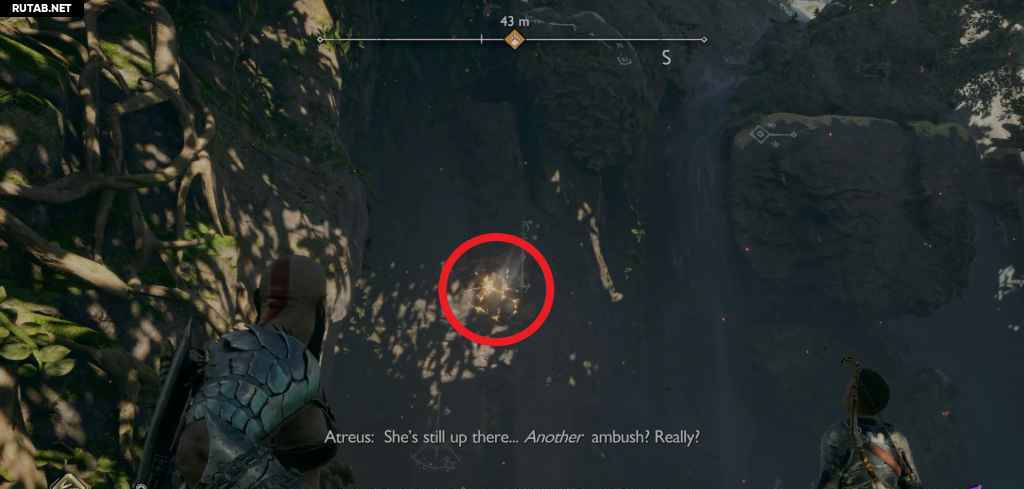 Продолжайте идти по пути через еще нескольких врагов, затем вам нужно будет бросить копье в место у водопада, чтобы сделать еще несколько зацепок для лазания. Поднимитесь до вершины водопада (путь уходит вправо, не идите туда).