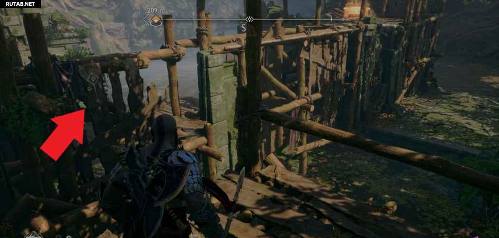 Продолжайте идти по пути обратно через ядовитые растения в большую область, где вы будете сражаться с другой волной Эйнхериев. Когда со всеми разберетесь, можете отправиться на северную сторону арены, чтобы пробраться через деревянный барьер.