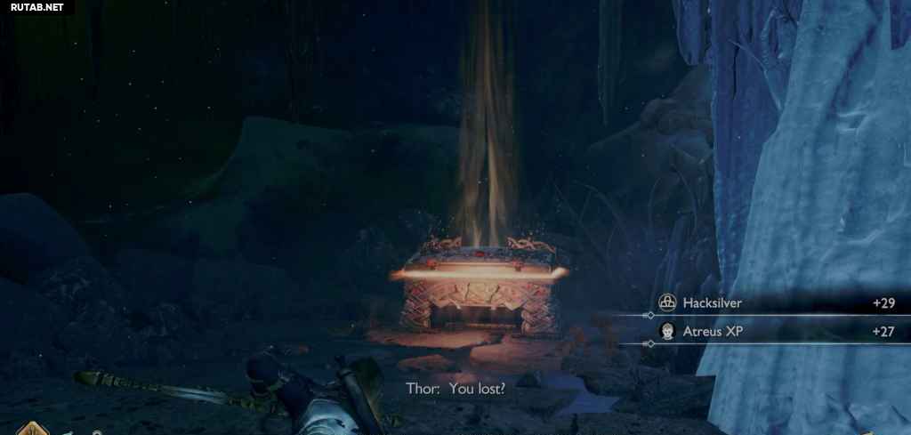 Однако Тор пока не хочет слушать и вместо этого разрушает стену справа. Вы можете пройти по пути до самого низа, чтобы найти сундук с материалами, который содержит 2 x Asgardian Ingot и 12 x Dwarven Steel.