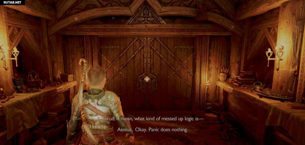 Вы вернетесь в комнату Атрея в домике. Вы можете воспользоваться гардеробом, если вам нужны предметы высшего качества, а затем отправиться в кабинет Одина.