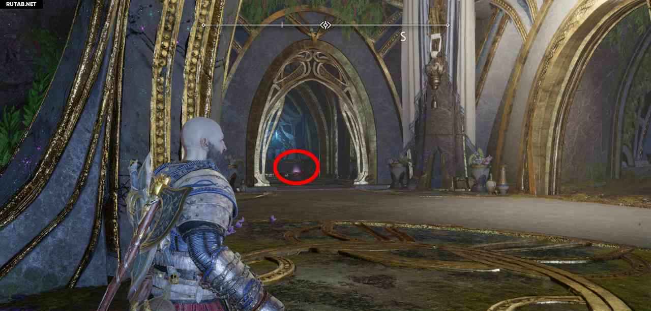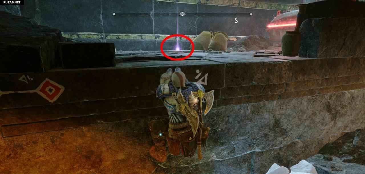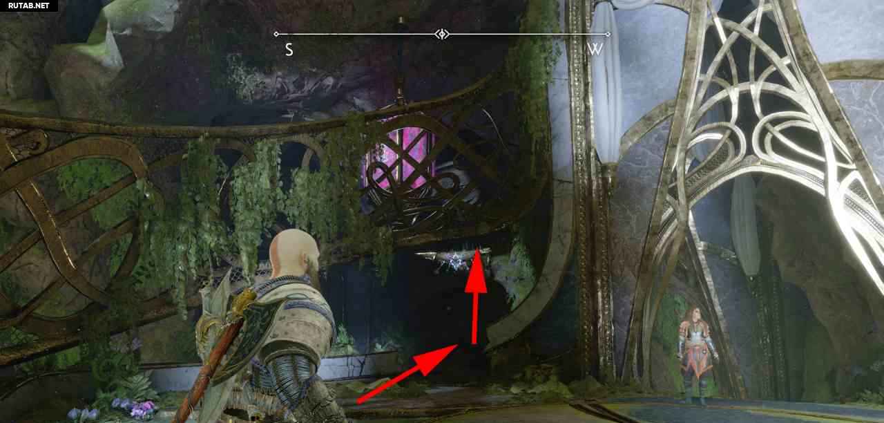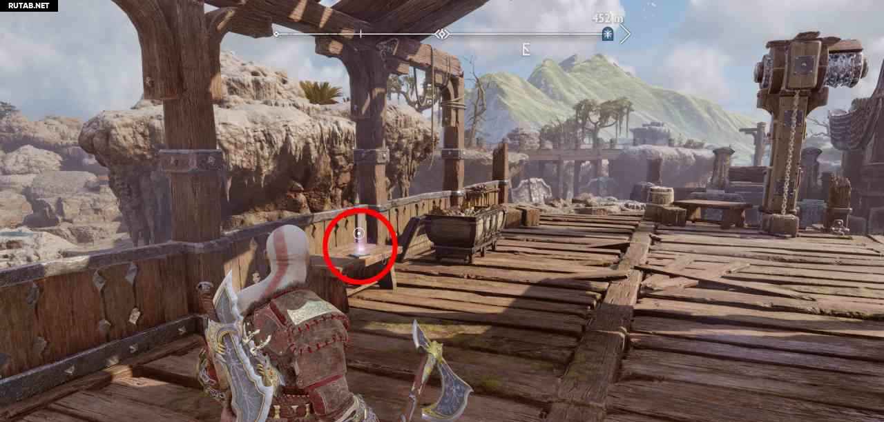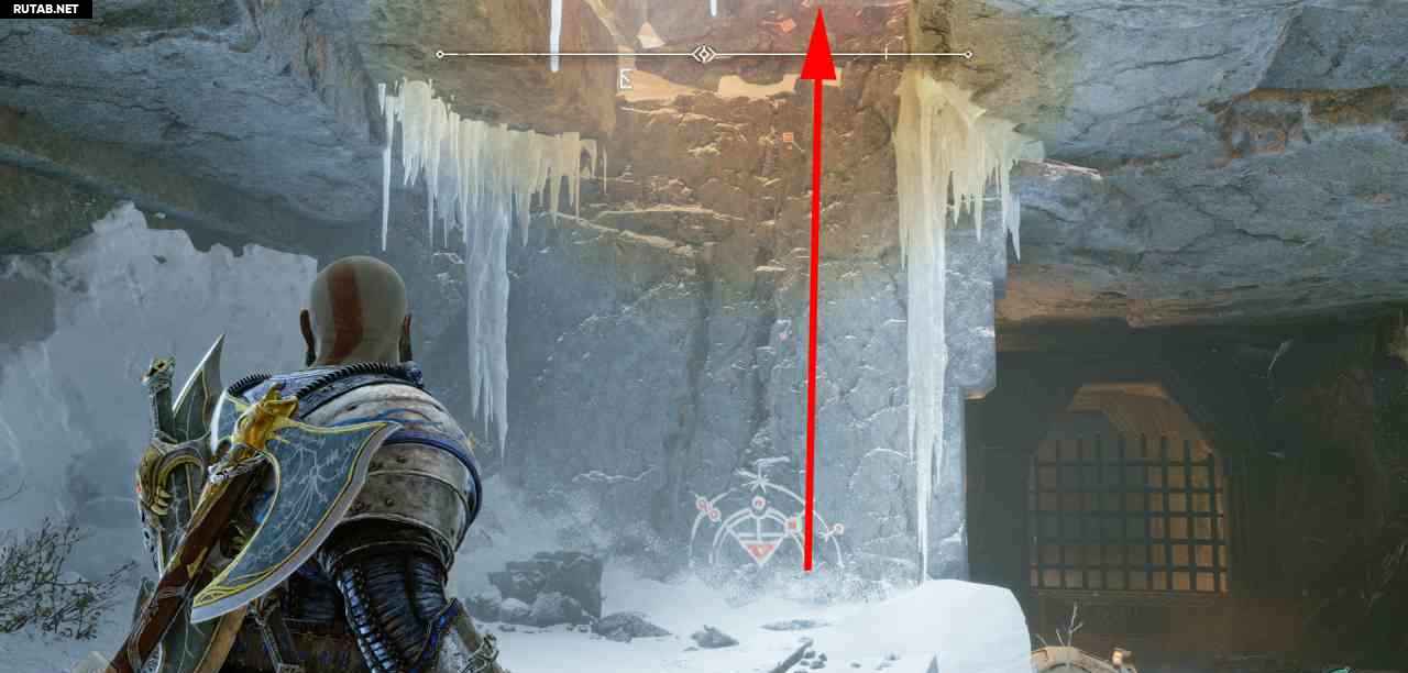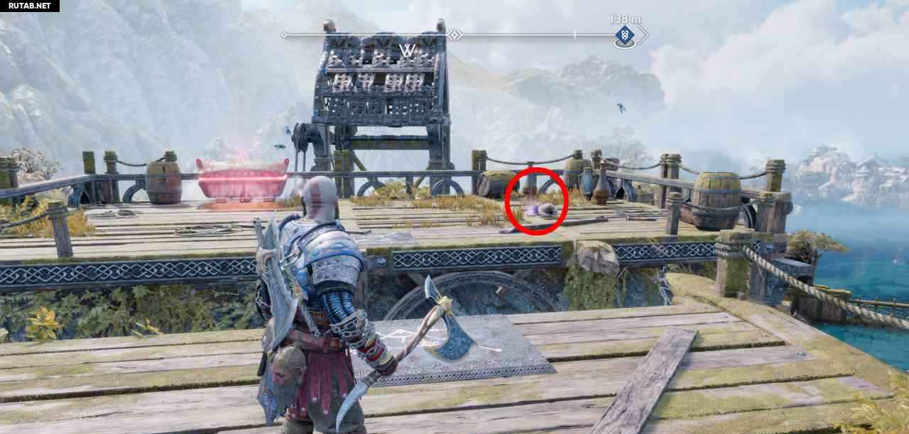 После того, как Кратос толкнет ворота, слева будет деревянное колесо, которое вы можете повернуть. Повернув его, забирайтесь обратно наверх, за следующей аркой артефакт находится слева.
