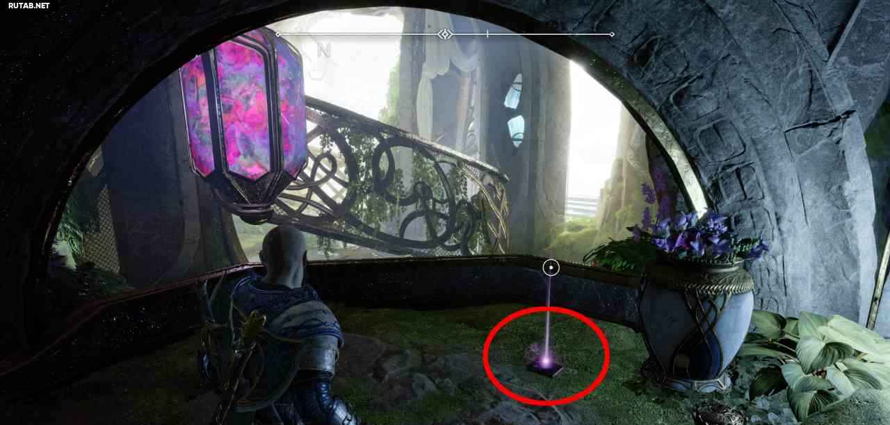 Идите до конца по винтовой лестнице. После выхода, прежде чем пройти через арку, поверните направо, и вы сможете взобраться на стену. Там вы найдете артефакт (светится фиолетовым).