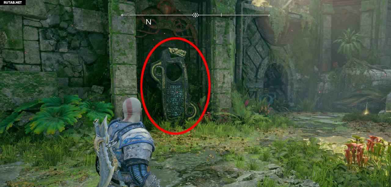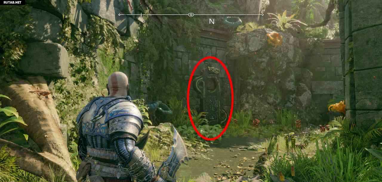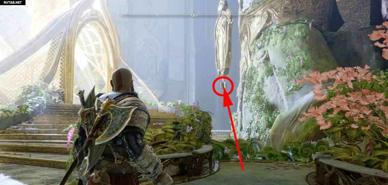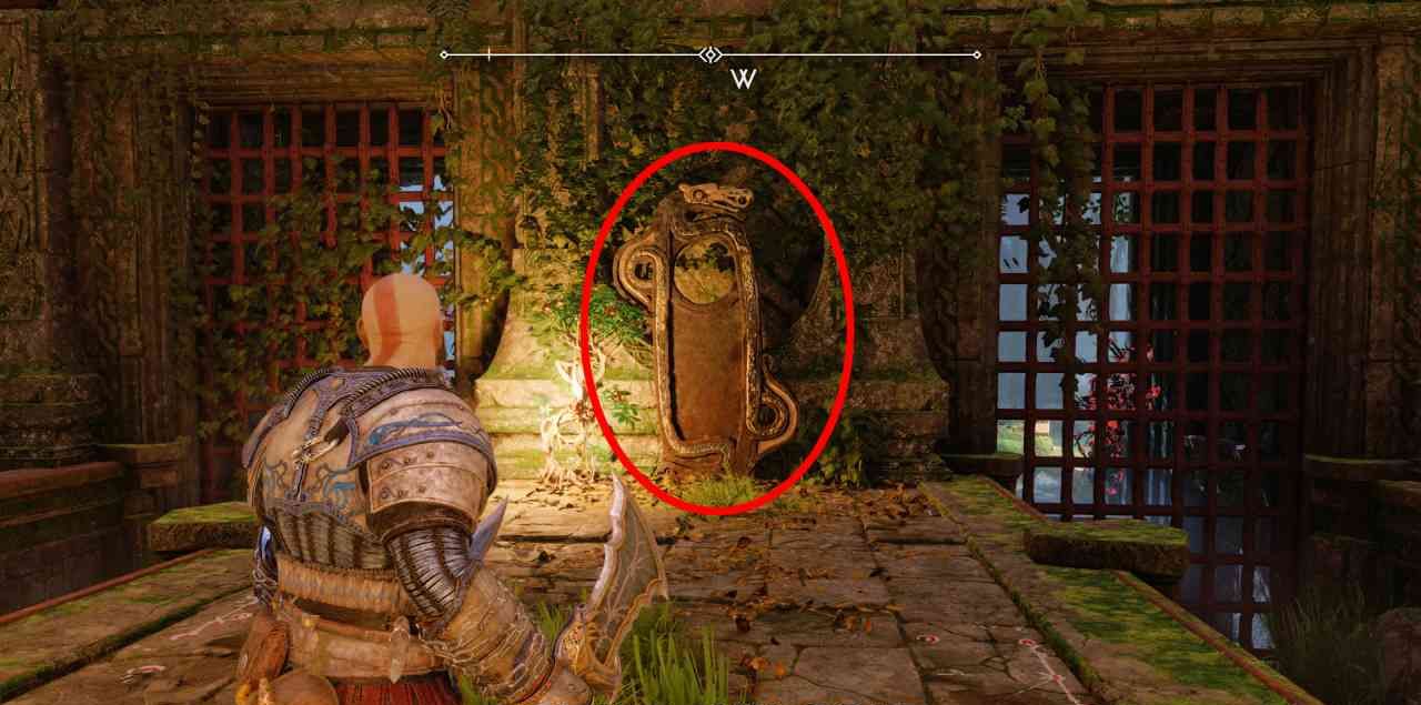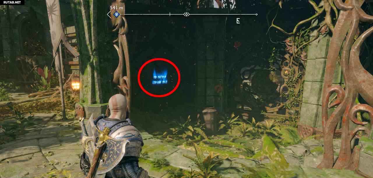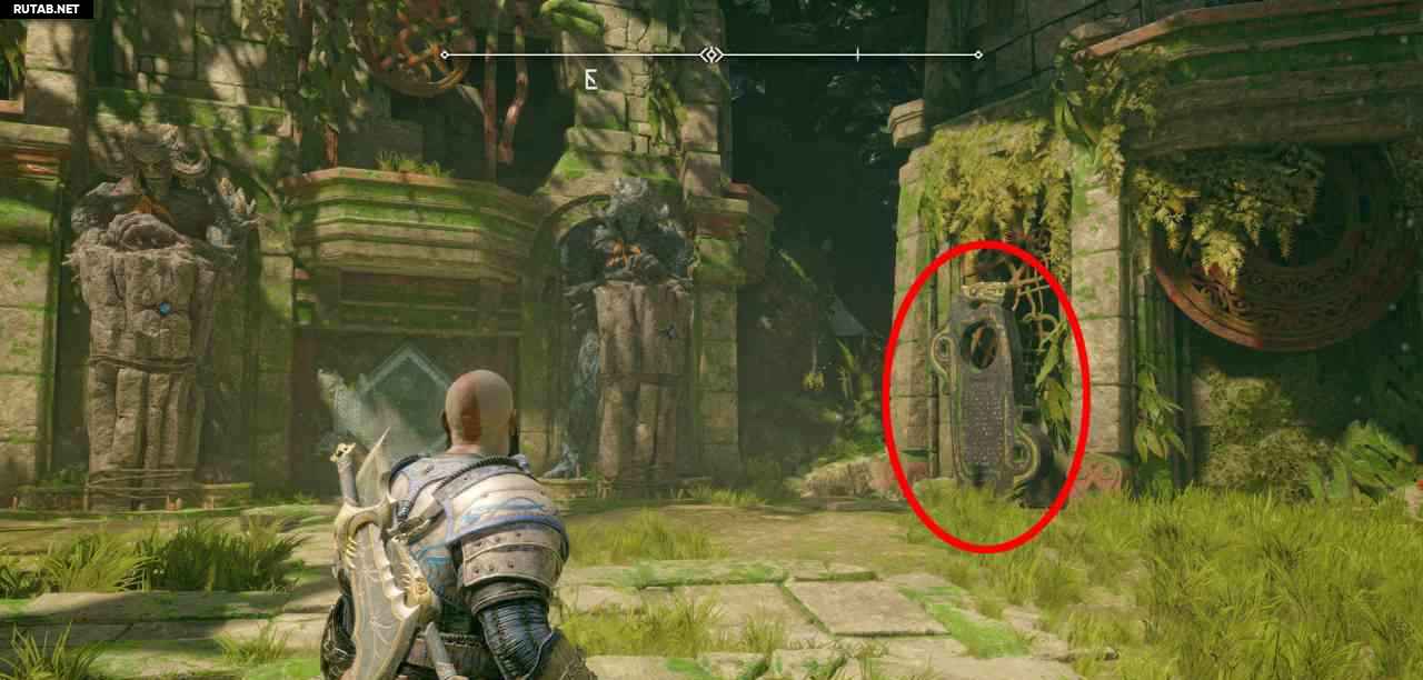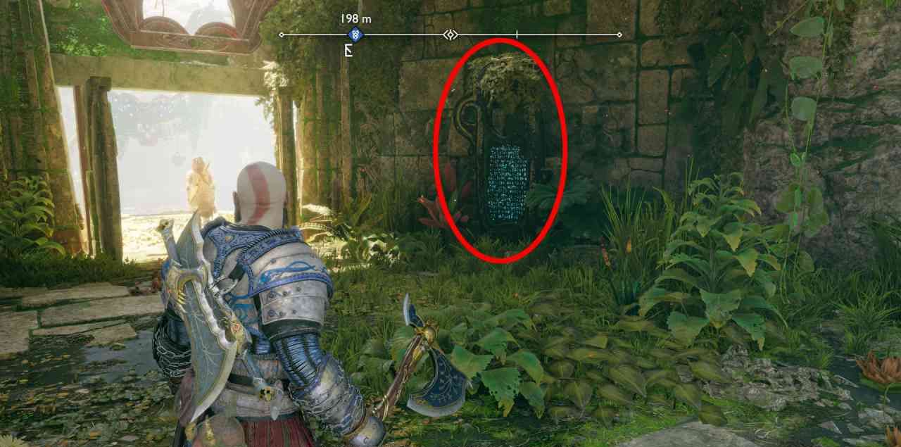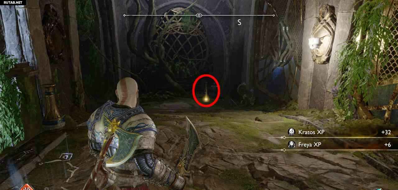 После получения вещей Фрейи используйте долото на алтаре справа. Затем спускайтесь обратно в основную зону. Теперь идите к воротам слева от того места, где вы впервые вошли в этот район. Вы должны зажечь две жаровни над воротами одновременно. Сначала очистите лианы под левой жаровней. Затем выстрелите 3 фиолетовыми руническими стрелами между двумя жаровнями и атакуйте их своими Клинками Хаоса, это зажжет обе жаровни одновременно. После этих ворот лор находится справа. Ищите синие буквы на стене. Сначала вы должны очистить врага, чтобы сделать это, сожгите лозы слева, чтобы подняться по тропе и победить маленьких монстров, которые усиливают другого врага.