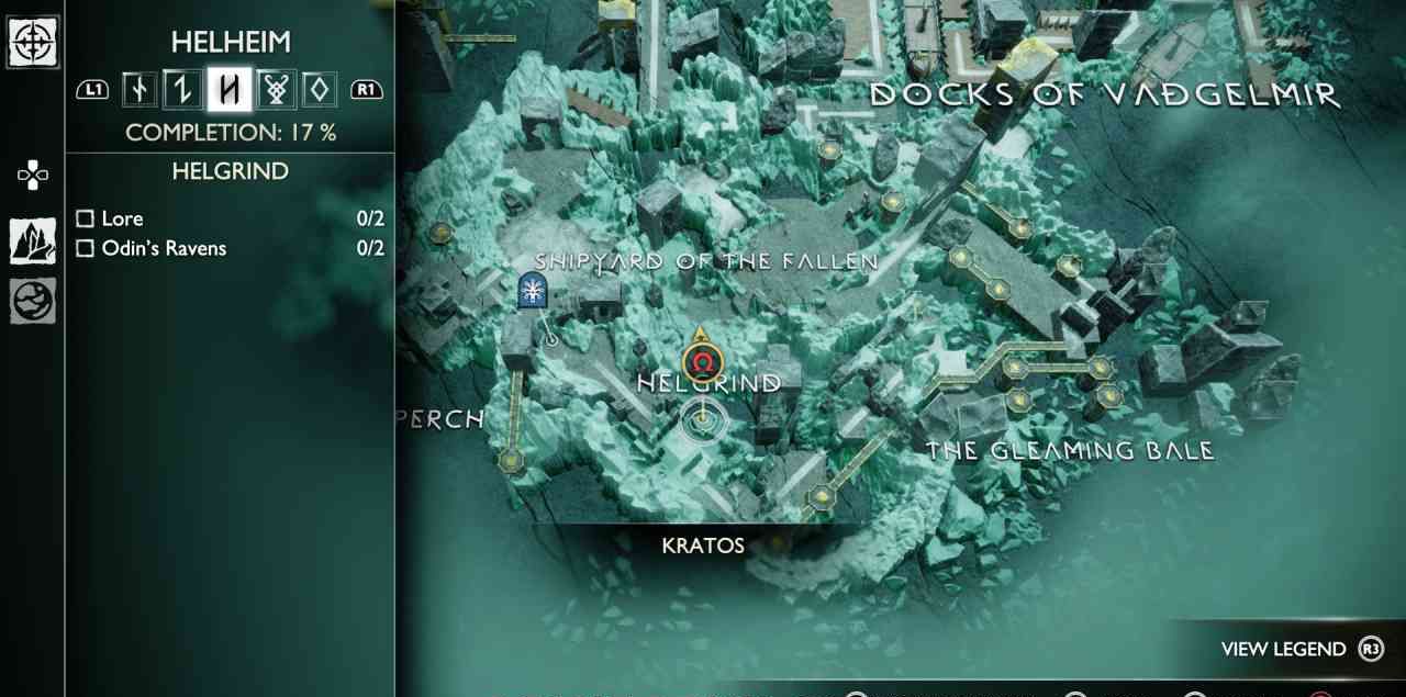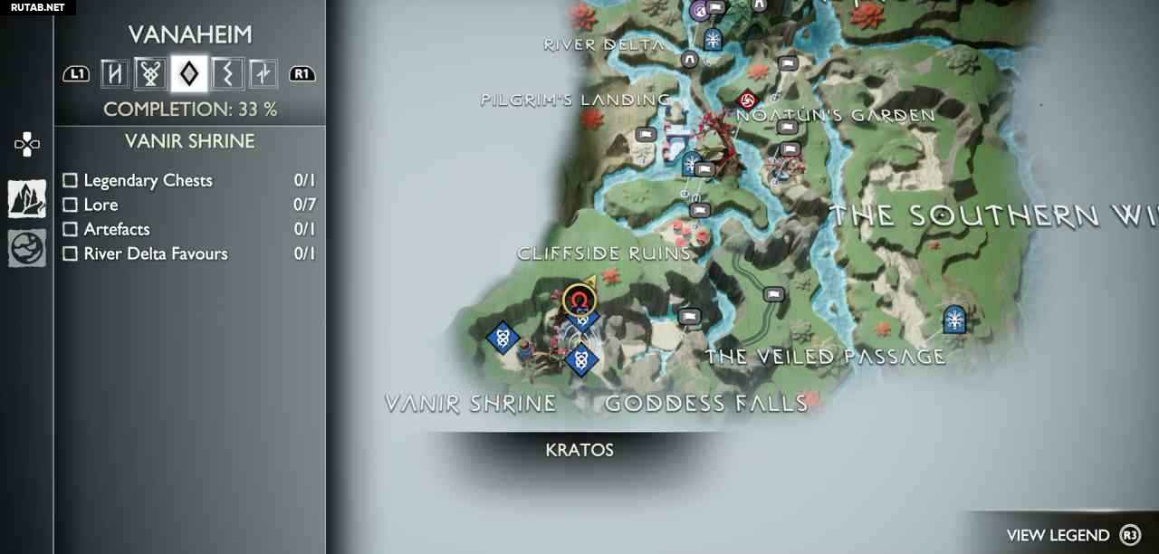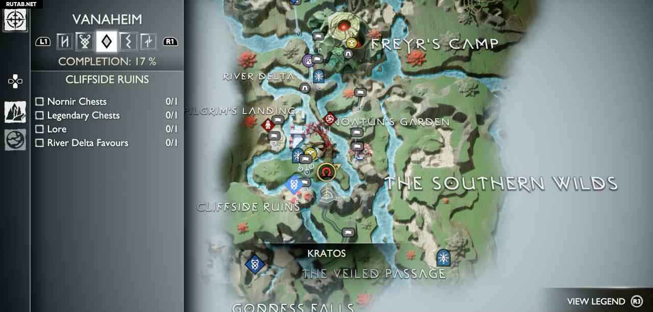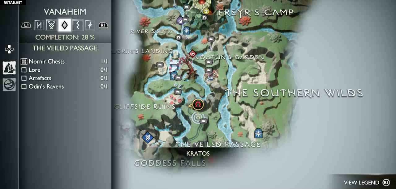 Приняв дело от призрака, поднимитесь по левой стене, снова прыгайте по платформам, где вы нажмете один из символов Норн. Со скалы свисает золотая цепь, но она заблокирована лианами. С платформы вы должны поместить 3 пурпурные рунические стрелы на скалы и атаковать своими Клинками Хаоса, чтобы вызвать цепную реакцию, которая сбросит золотую цепь. Поднимитесь и используйте долото на алтаре, чтобы избавиться от камней, блокирующих реку. Вернитесь в свою лодку и гребите на юг. Пройдя точку, где скалы перекрыли реку, вы должны повернуть налево, чтобы войти в другую область — Сокрытый проход. Пройдите через этот регион, убивая всех врагов по пути, чтобы завершить дело. Пройдя через регион, вы окажетесь на другой стороне руин Скалы, там вы найдете маркер знаний.