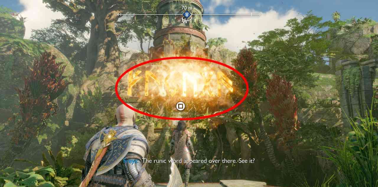 Слева от «Вещей Фрейи» позвольте Фрейе открыть зеленые лозы с помощью своей магии, затем используйте Алтарь за ним. Теперь вернитесь в среднюю зону и взаимодействуйте с желтыми буквами на сломанном мосту (нажмите