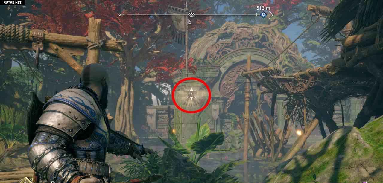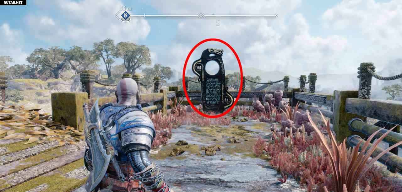 Вы должны опустить разводной мост справа от области, рядом с маркером знаний. Для этого разместите на стене фиолетовые рунические стрелы и атакуйте их Клинками Хаоса, чтобы сжечь лианы. Затем бросьте свой топор в два замка на мосту. После прохождения моста в следующей области находится маркер знаний.