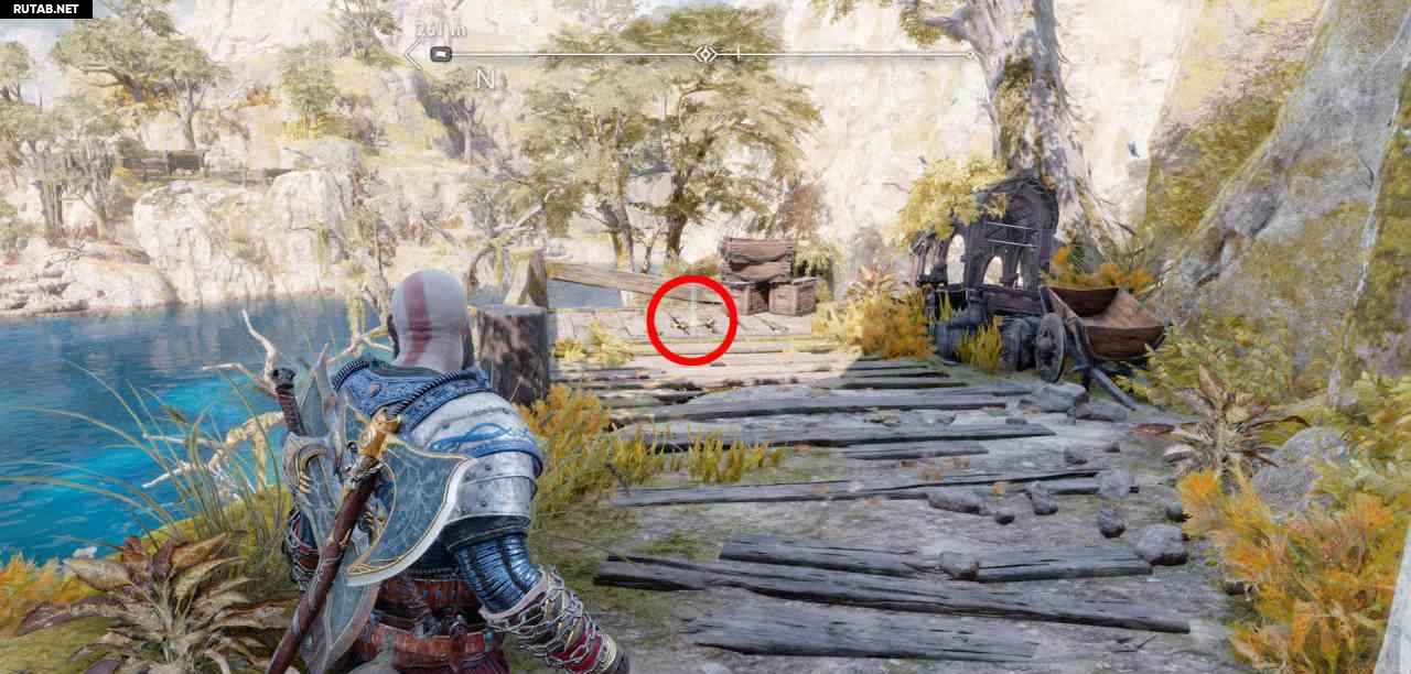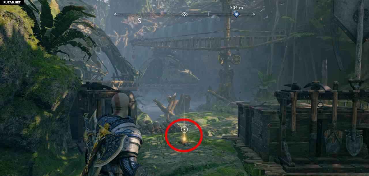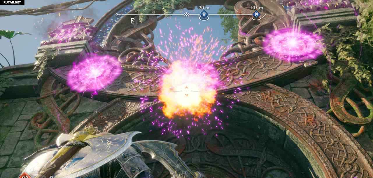 С берега поднимитесь на мост и выстрелите фиолетовой стрелой в огонь возле лоз, это вызовет взрыв и сожжет лозы, затем бросьте топор в замки. чтобы мост рухнул. Пройдите через мост и слева вы найдете Маркер Знаний.