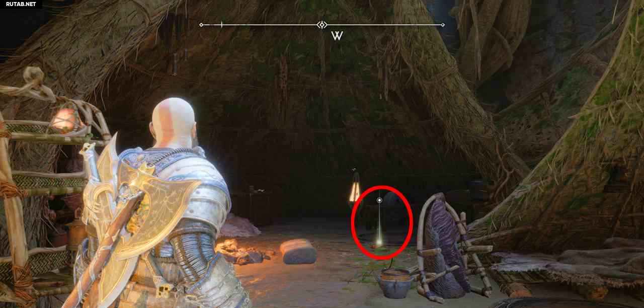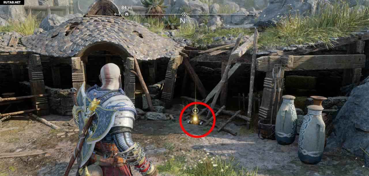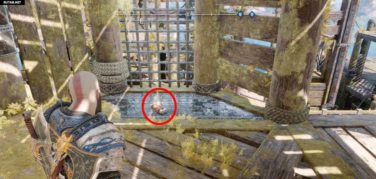 В верхней части города из деревянного столба выходит немного газа/ветра. Для этого вам понадобится копье (открывается во время основной миссии 10: «Ковка судьбы»). Бросьте копье по ветру в столб, это создаст путь для подъема. Сидя рядом с легендарным сундуком, найдите на полу светящийся зеленым свиток.