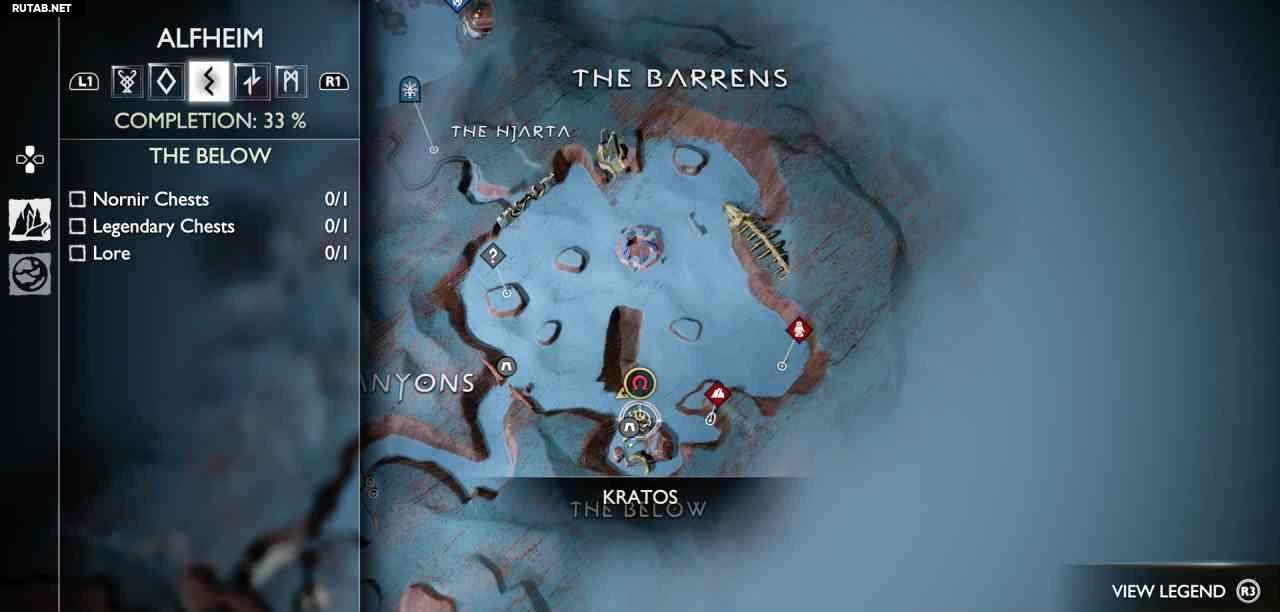 «Внизу» можно достичь, пройдя через Альфхейм >Ущелье > Каньоны > Степи > Внизу. Как только вы войдете в Степи, вы получите Дело «Тайна песков». который приведет вас под землю в пещеру «Внизу». В регионе есть линейный путь только с 3 предметами коллекционирования. Во-первых, это Знания, это после того, как стрелок 3 красных мешка с топором, в комнате со столкновением с Темными Эльфами, вы можете взобраться на стену и бросить свой топор в красные мешки, чтобы открыть сундук с ресурсами и Знания.