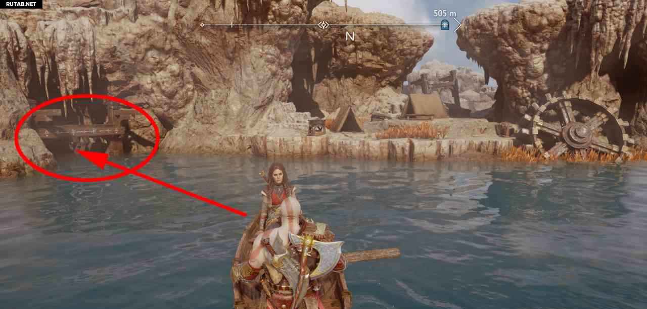 Продолжайте двигаться на север на своей лодке, пока не доберетесь до точки, показанной на изображении ниже. На левой стороне реки есть отверстие, где вы можете нажать