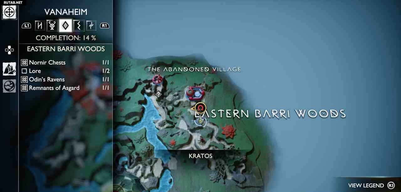 Войдите в область из восточного леса Барри. Собрав знания в конце Восточного леса Барри, спрыгните со стены и качайтесь по воде. Следуйте по пути, пока вам не придется скользить по веревке, затем войдите в следующий павильон слева. Используйте копье, чтобы перебраться, следуйте по участку лазания и пройдите через пещеру. Когда вы доберетесь до поворотного подъемного крана, используя Клинки Хаоса, Знания будут на левой стене (синие буквы).