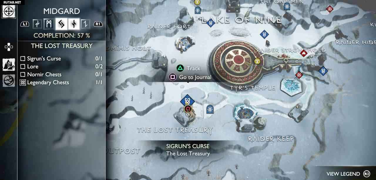 Внутри потерянной сокровищницы. Для этого требуется полный ключ от хранилища Фьортлунда, сначала следуйте инструкциям для этих регионов, они содержат ключевые части: предметы коллекционирования гребцов + предметы коллекционирования заброшенного аванпоста. Собрав 2 части ключа из этих регионов, вы можете открыть дверь здесь, в потерянной сокровищнице. За дверью победите врагов, затем маркер знаний будет справа. Это последняя цель, чтобы завершить Дело : «Проклятие Сигрун». Взаимодействие с маркером знаний автоматически завершает дело.