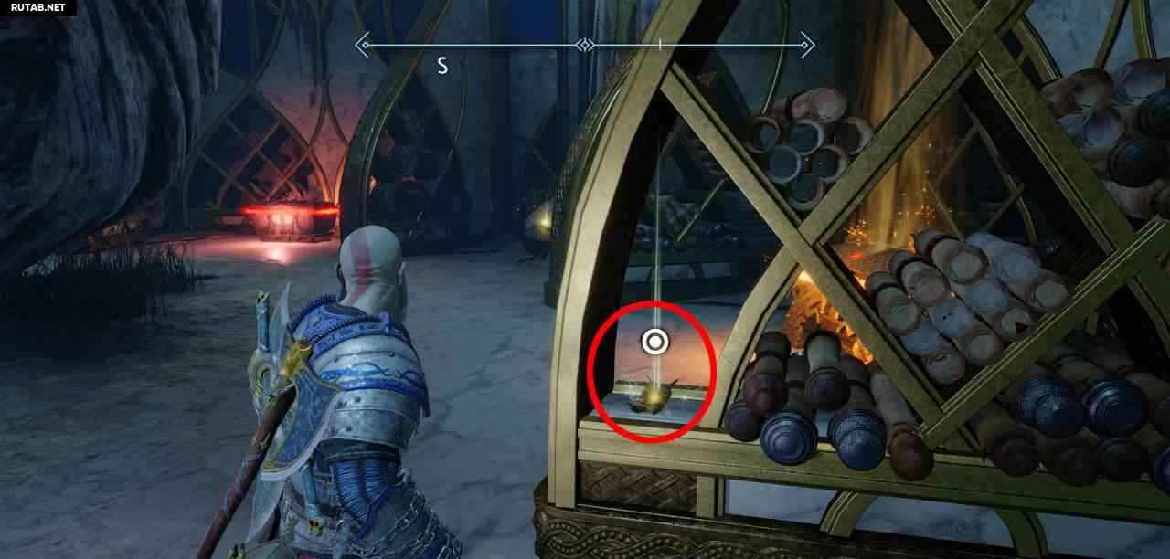 . Затем вы можете обогнуть стену за вазами (на стене есть белые значки, указывающие на путь лазания). Перепрыгните на золотую цепь, соскользните вниз по цепи, снова используйте колесо, чтобы поднять точку захвата на самый верх. Поднимитесь обратно по той же золотой цепи, теперь вы можете использовать крюк, чтобы перепрыгнуть, в воздухе нажмите