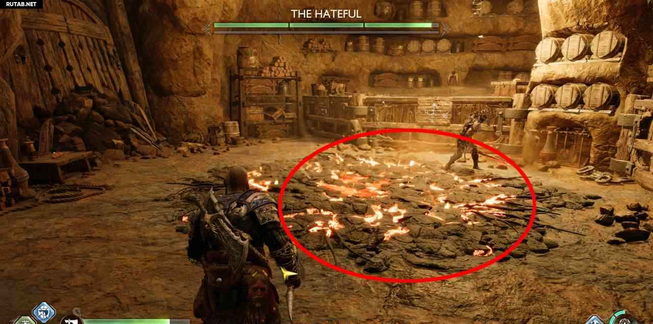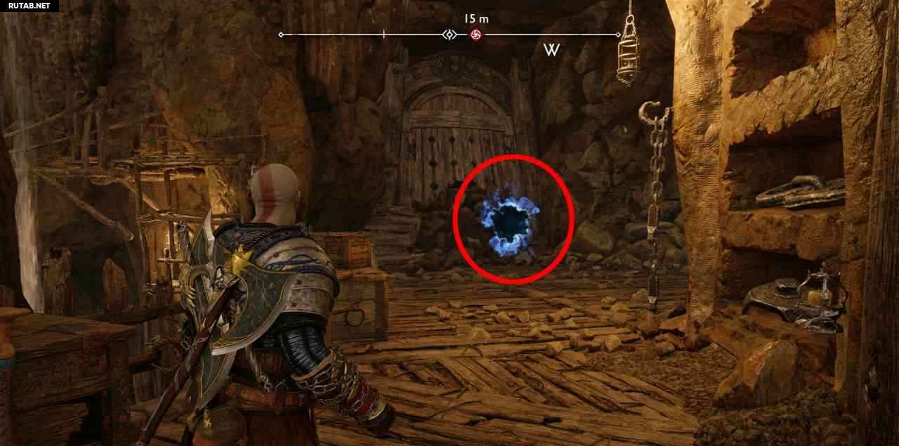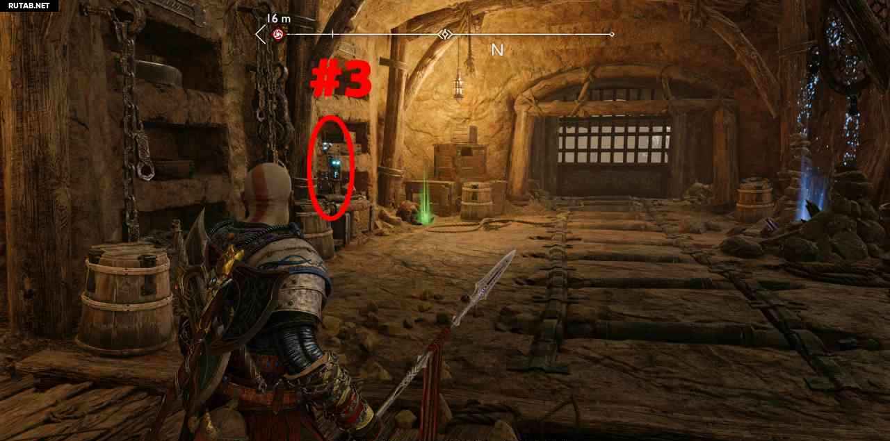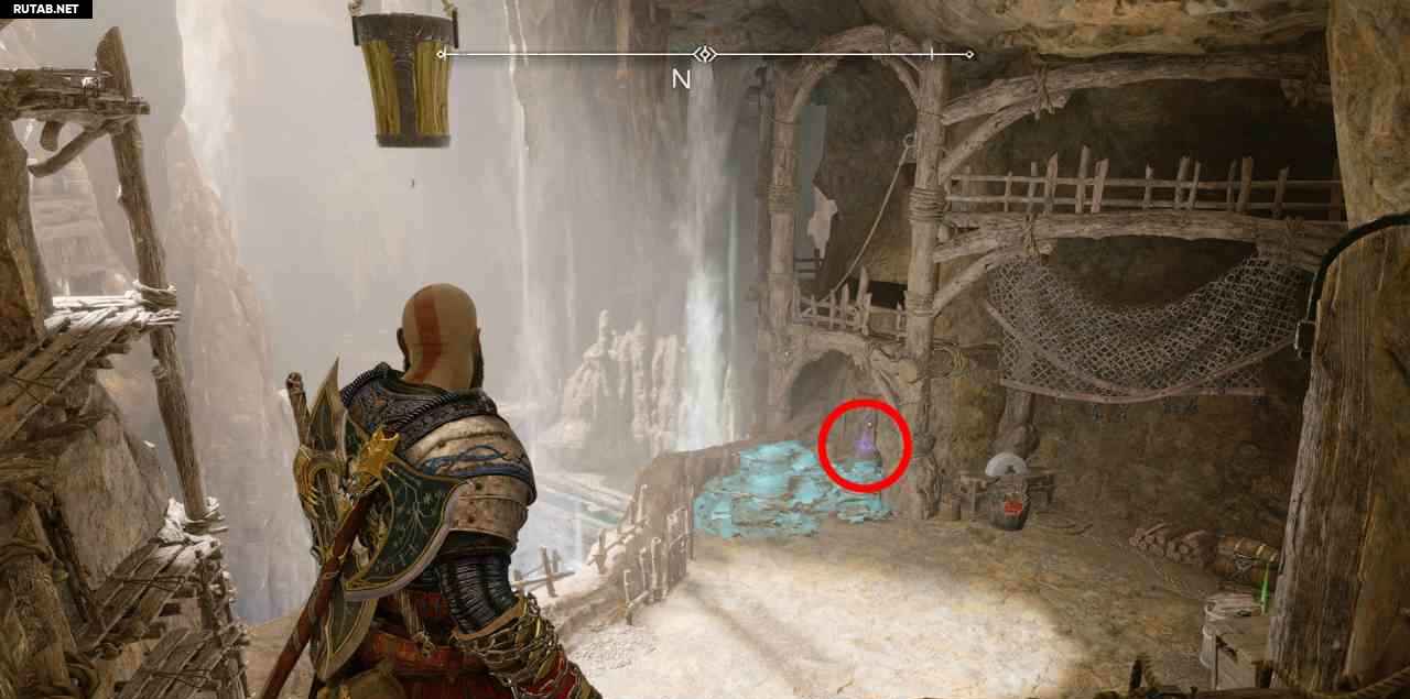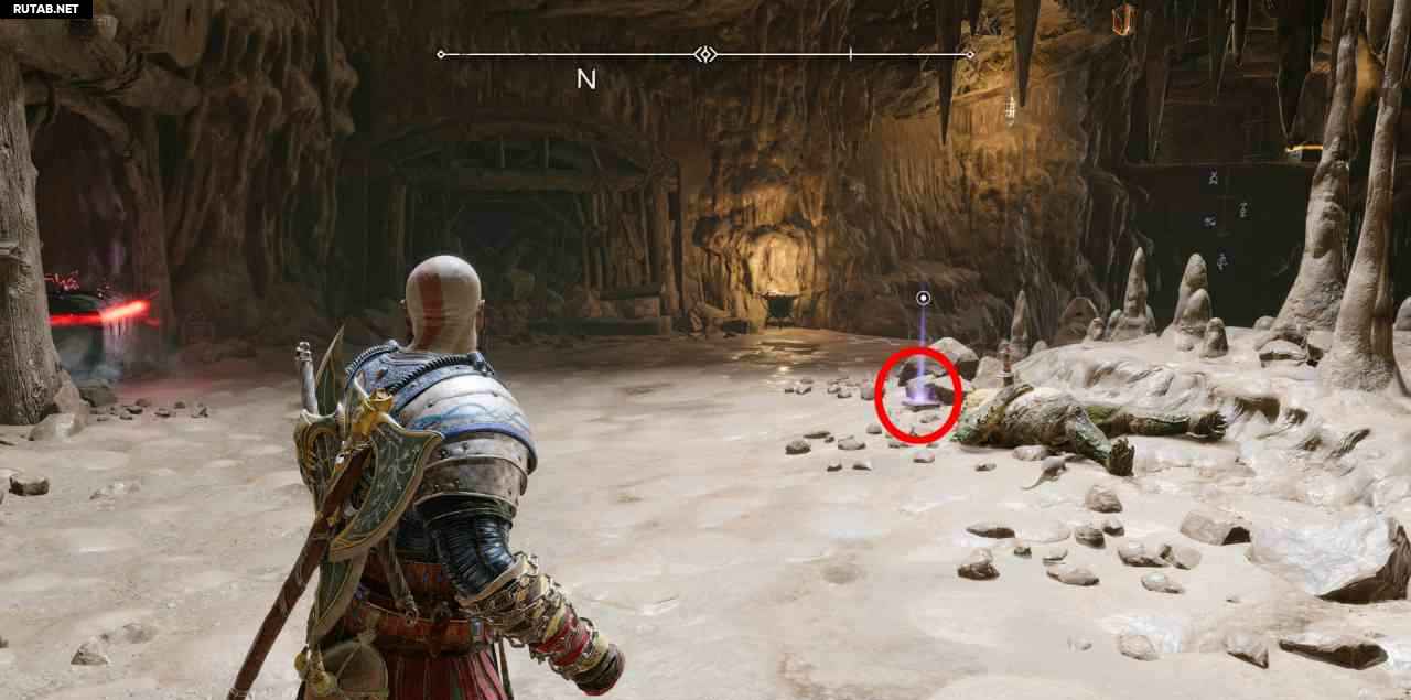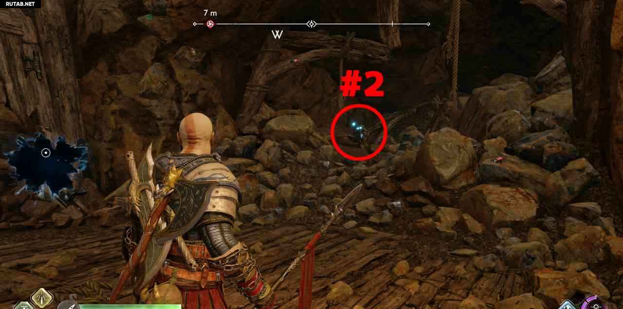 От Сундука Норн спуститесь вниз и идите в конец области. Там вы вонзаете еще одно копье в стену, чтобы взобраться наверх. Поднявшись наверх, поверните налево и взорвите щебень копьем, за ним на полу Артефакт (фиолетовый предмет).