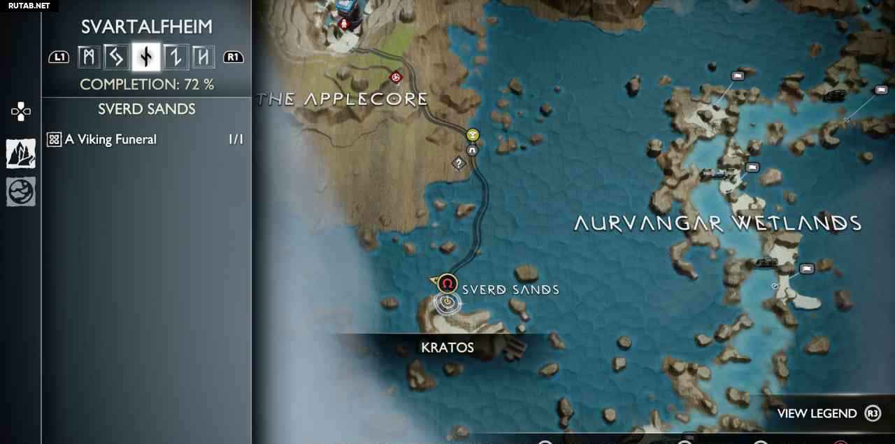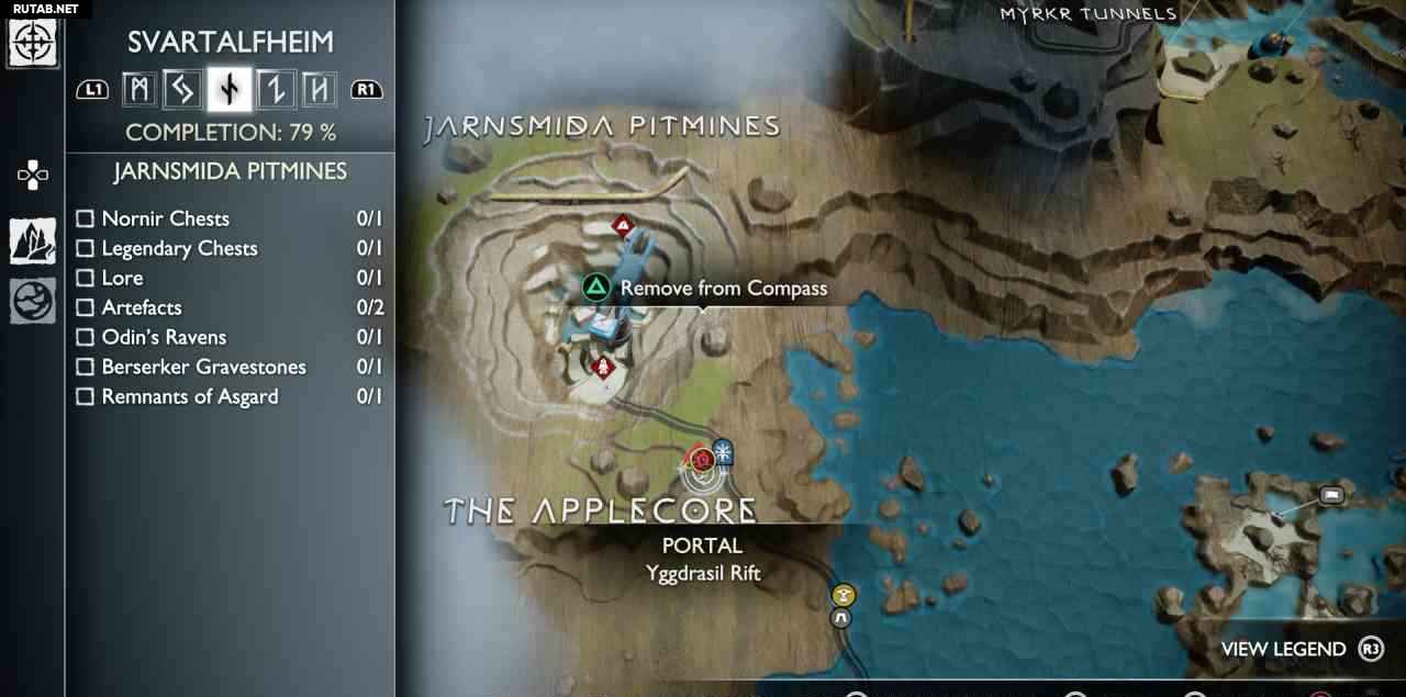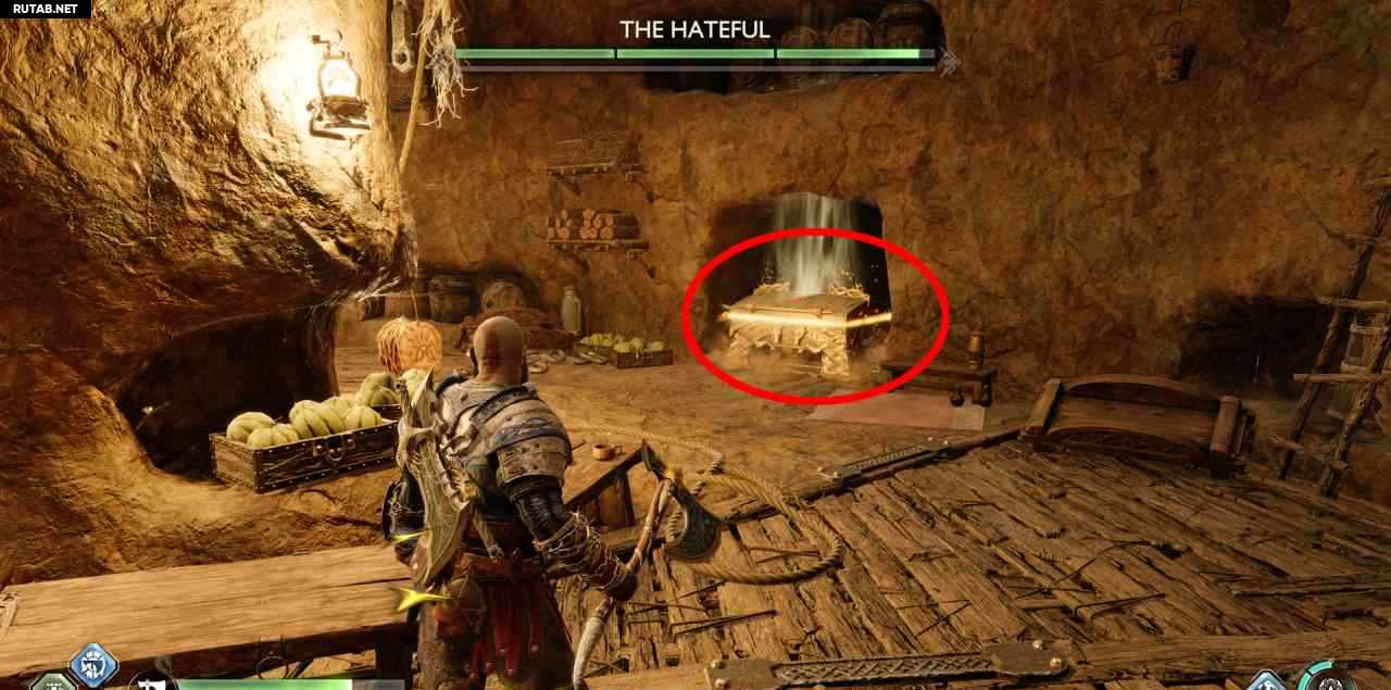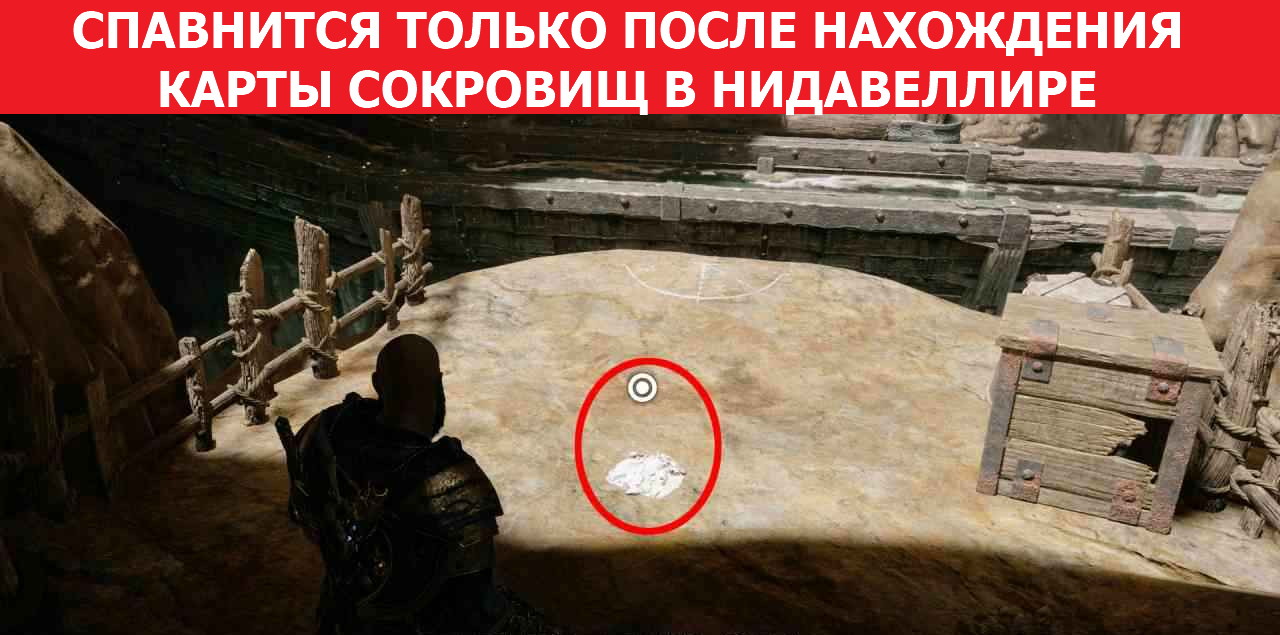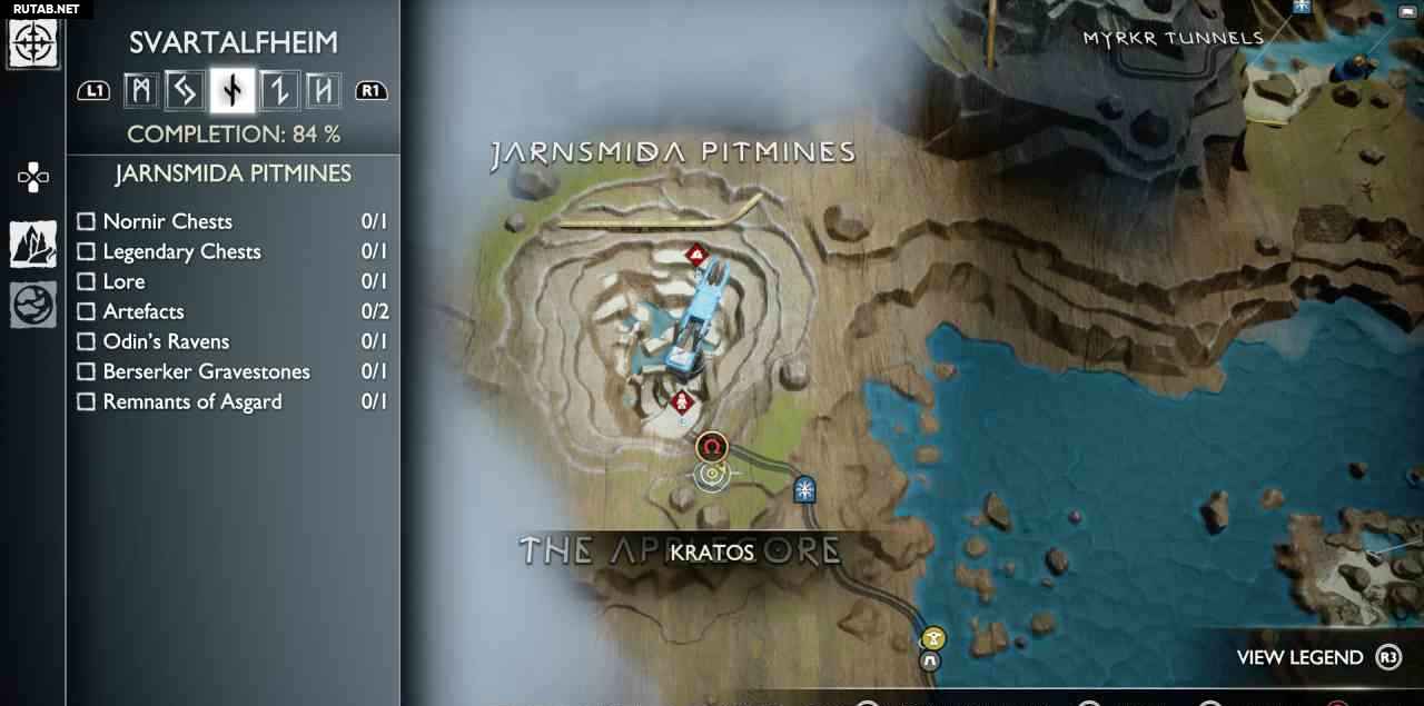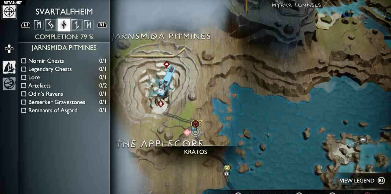 От легендарного сундука выйдите из комнаты, поднимитесь наверх слева, затем поверните направо. Используйте крюк на потолке, чтобы перепрыгнуть через него, затем при первой же возможности спрыгните вниз справа. Теперь следуйте по нисходящей спирали по нисходящей спирали к нижней части области. Сокровище будет в конце путей справа, рядом с рекой, куда вы отправились на лодке по сюжету. Чтобы сокровище появилось, вы должны сначала собрать карту сокровищ, она находится в свитке знаний, который можно найти в Свартальфхейме > Нидавеллир. См. Предметы коллекционирования Нидавеллира: #6 Легенда (Карта сокровищ — Шахтерская слава). Вы получите его автоматически при 100% прохождении Нидавеллира. Вернитесь сюда после этого, сокровище будет светиться золотом на земле. Вам всегда нужна карта сокровищ, чтобы само сокровище появилось.