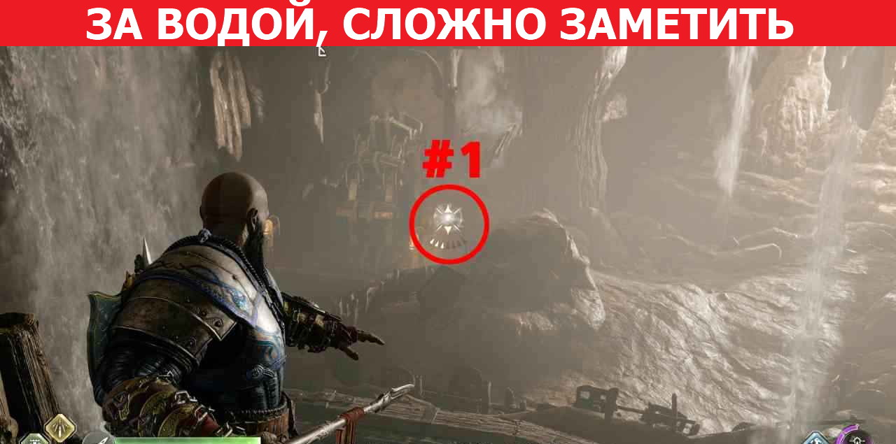 Там же, где и разлом Иггдрасиля, на правой стороне. Вы должны бросить копье в 3 печати с глифами и взорвать их одновременно. Первый находится справа от сундука, вдали за водой. Его трудно разглядеть, вы можете увидеть голубое мерцание сквозь воду, и при наведении на него сетка должна измениться (см. изображение с № 1 ниже). Второй находится слева от сундука, где был Разлом, нужно бросить топор во взрывчатую вазу, чтобы расчистить завалы, тогда глиф станет виден. Третий находится на дорожке посередине, рядом с Мистическими воротами. Взорвите все 3 копья с помощью