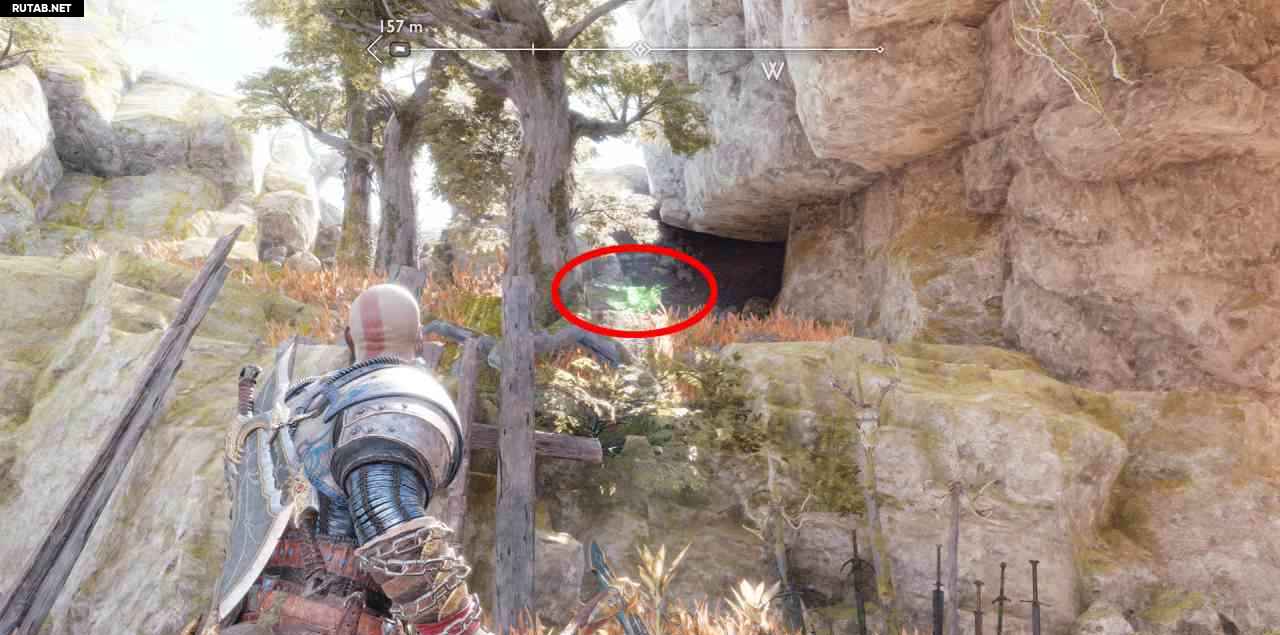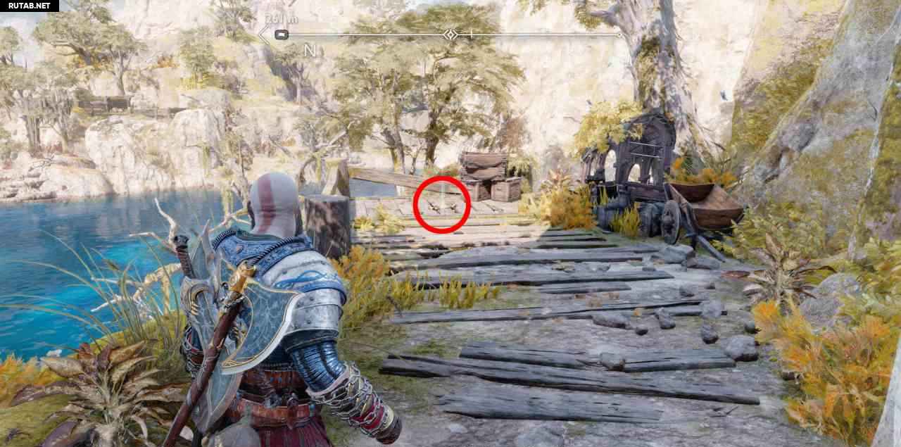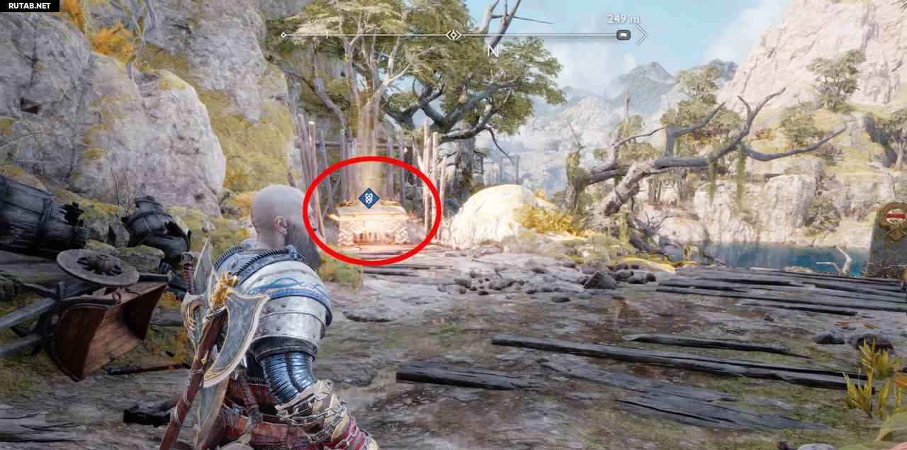Чтобы получить доступ к Теснина Альбериха, вам сначала понадобится Копье (сюжетное разблокируется в основной миссии 10: «Кузнец своей судьбы»). Идите в район Драконий берег и поднимитесь по золотой цепи на левой стороне берега. Затем вы должны бросить копье в ветер, выходящий из деревянного шеста, это создаст путь для подъема. Сразу после подъема проверьте правый угол на наличие призрака, с которым можно поговорить. Он дает вам просьбу «Забытое сокровище». Цель находится в самом конце Теснина Альбериха (отмечена на карте синим значком). Продолжайте с другими предметами коллекционирования, и мы закончим задачу в конце.
