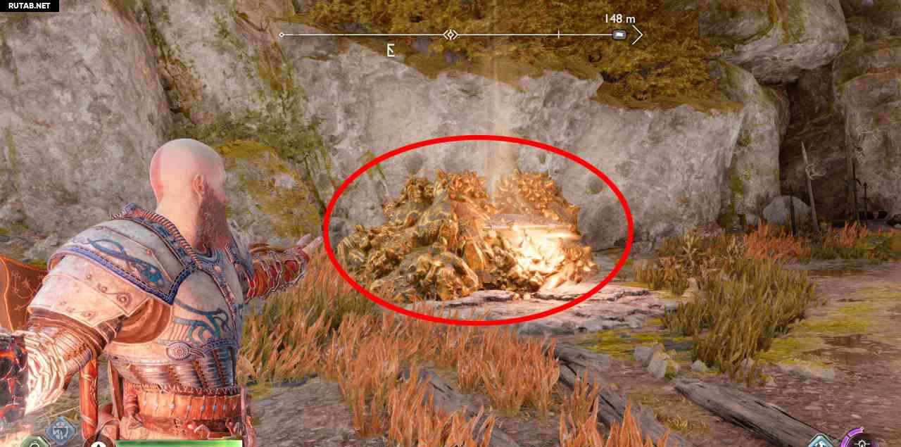 на горящую вазу слева, чтобы схватить разрывной снаряд, бросьте его в золотую руду, чтобы взорвать ее. Теперь вы можете открыть сундук. Этот сундук может содержать семя Муспельхейма (если вы еще не нашли 2 из них) или Божественный пепел (если вы уже нашли 2 семени Муспельхейма).