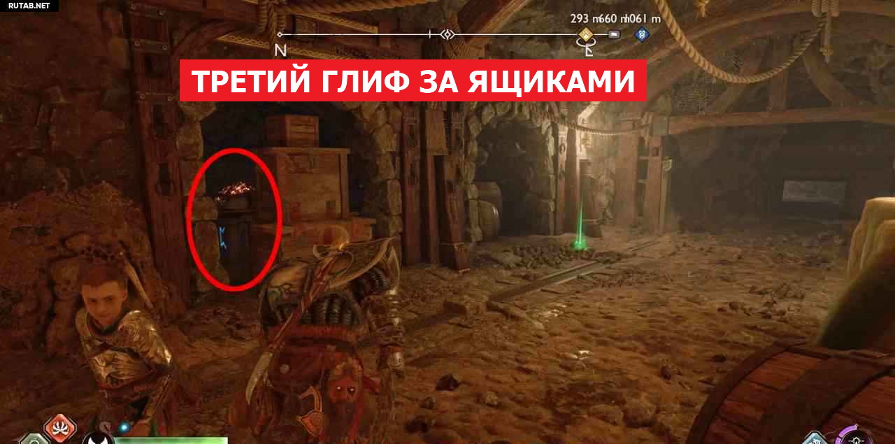 От легендарного сундука вернитесь прямо в комнату, откуда мы пришли (водная головоломка). Теперь в этой комнате выберите левый выход, вы должны присесть под камнями. На другой стороне вы найдете Сундук Норн. Требуется поджечь 3 глифа. Первый находится слева от сундука, ваши Клинки Хаоса не могут добраться до него, поэтому вы должны бросить топор в бочонок рядом с ним, чтобы пролить масло, затем стрелять фиолетовыми стрелами вокруг и поджечь фиолетовые стрелы Клинками Хаоса, это вызывает цепную реакцию, которая поджигает масло и глиф. Второй глиф находится слева от первого (напротив сундука). Третий находится в туннеле напротив сундука (откуда вы пришли), он спрятан за деревянными ящиками, которые вы должны сначала уничтожить. Поджег их всех, сундук можно открыть.