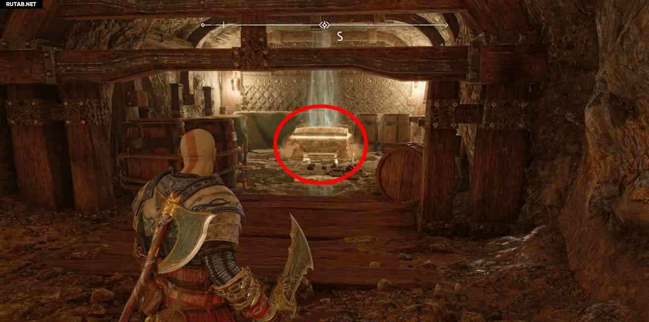 От разлома Иггдрасиля развернитесь, войдите в следующую комнату, где по сюжету происходила водная головоломка. Пройдите через левый выход, а затем продолжайте идти прямо, пока не дойдете до тупика с красными лозами. Сожгите лозы, стреляя в них фиолетовыми стрелами, и используйте клинки хаоса, чтобы поджечь их. За виноградными лозами находится легендарный сундук.