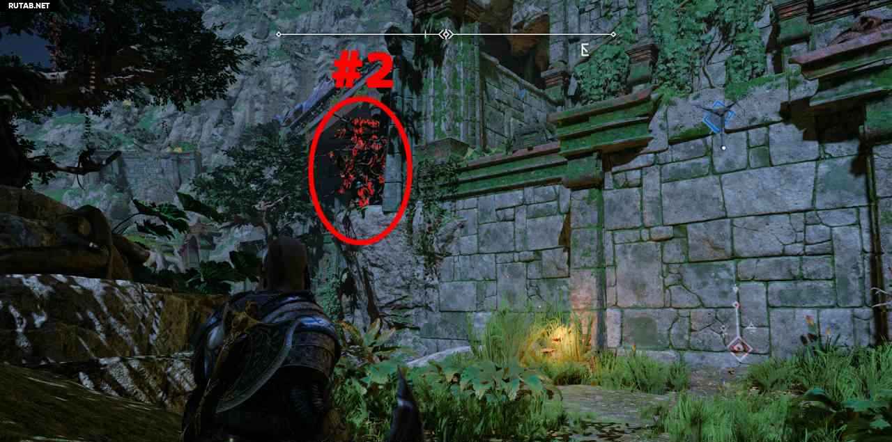 На том же острове, где находятся Мистические ворота, поднимитесь по стене за Небесным алтарем. Следуйте по участку скалолазания, пока не дойдете до красных лоз. Сожгите их, поместив 3 тройных фиолетовых рунических стрелы и атакуя их Клинками Хаоса (вы можете выстрелить 3 стрелами в одно и то же место, чтобы создать больший радиус действия). После того, как лозы исчезнут, вы сможете перепрыгнуть через легендарный сундук.
