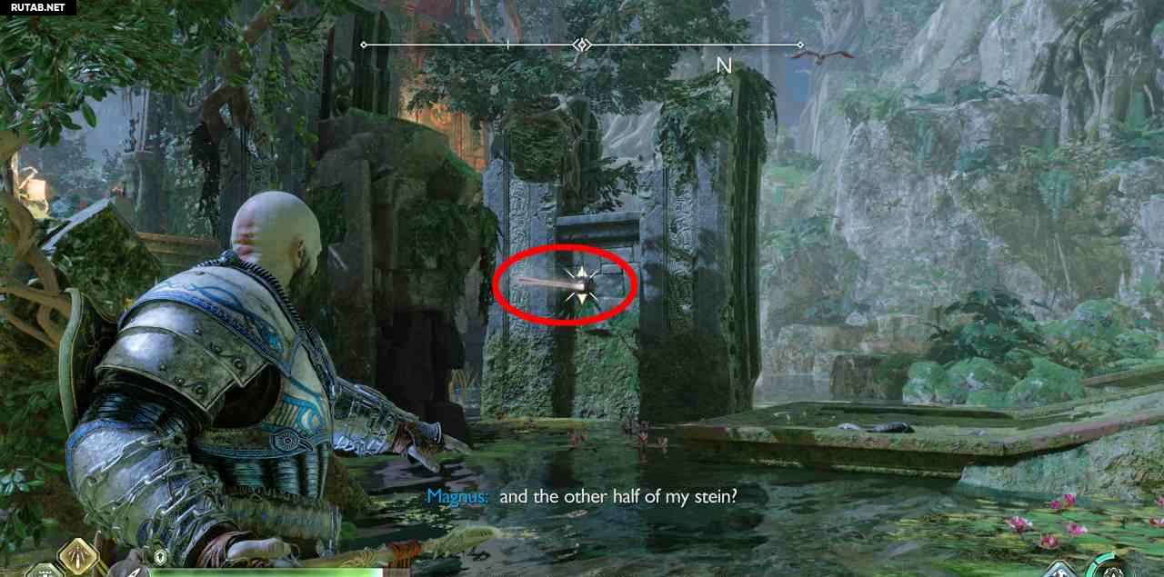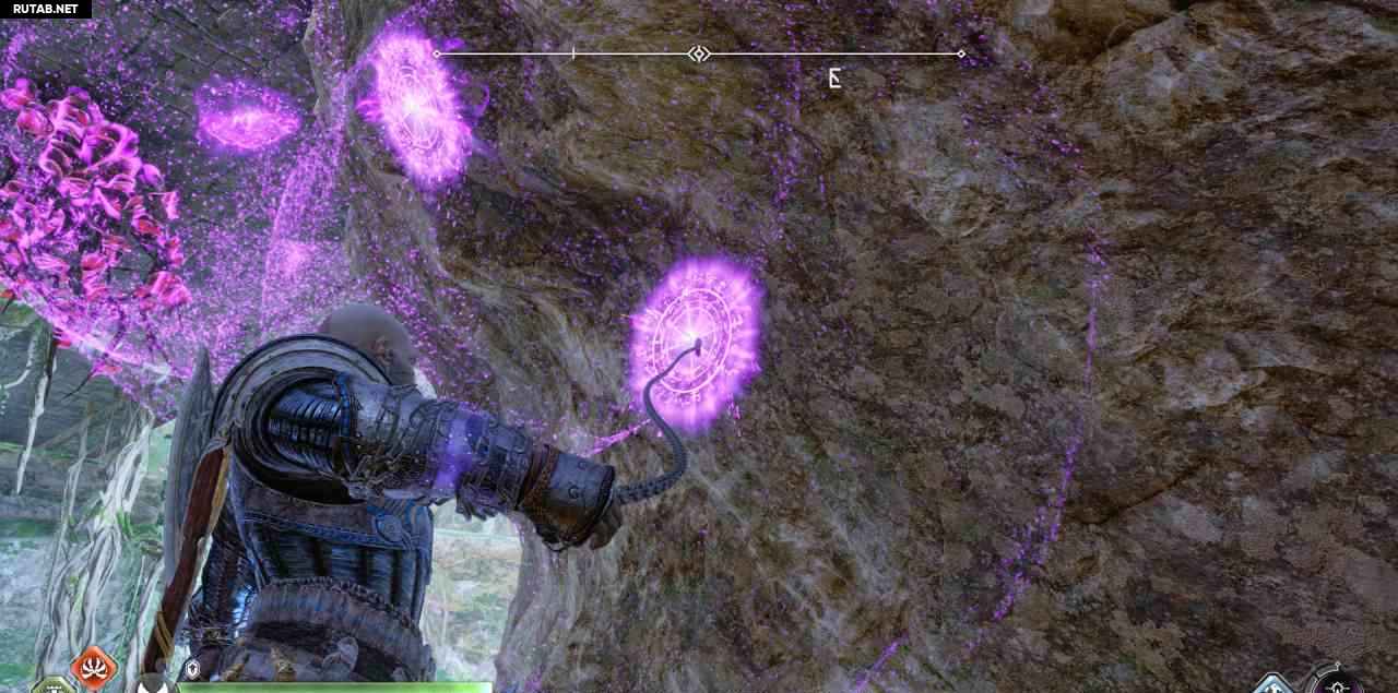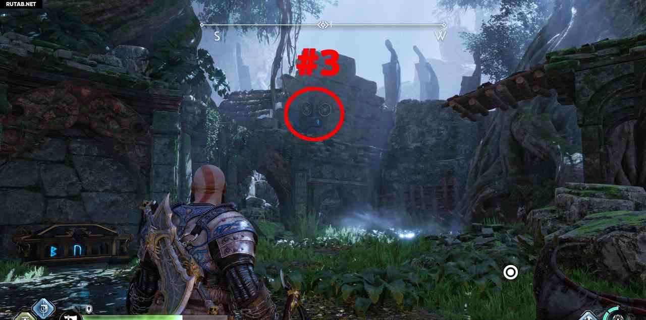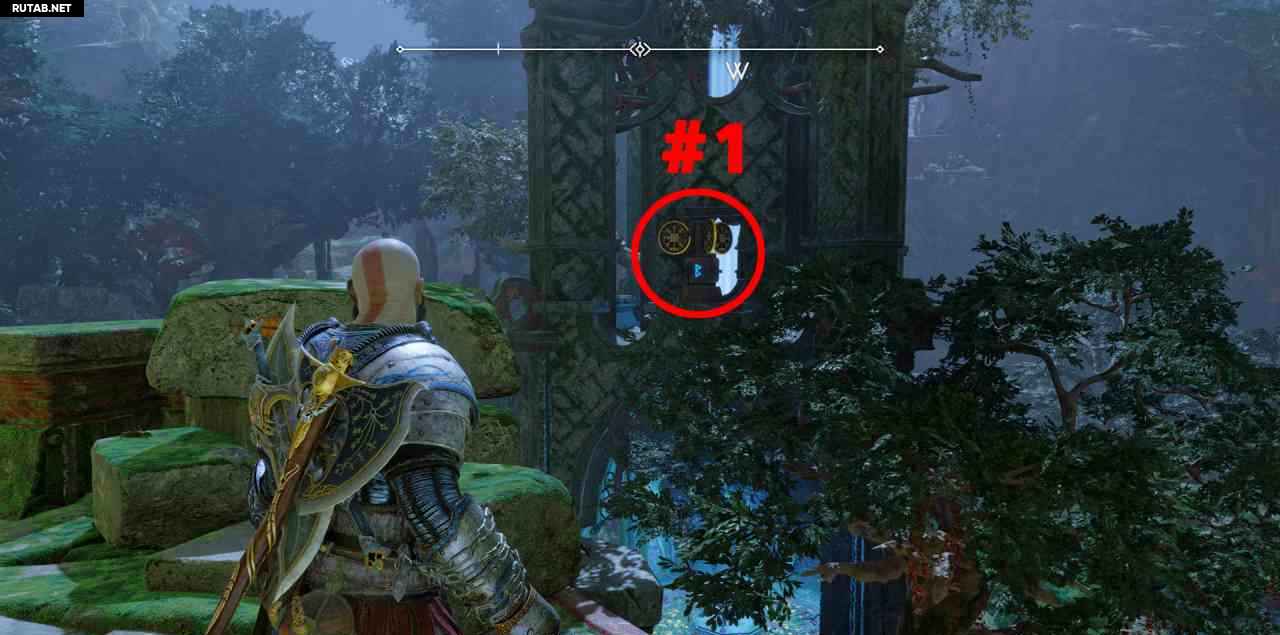 После легендарного сундука вернитесь в область с Мистическими воротами. Есть 3 глифа Норн, которые вы должны ударить своим топором, пока они не отобразят правильный символ. Первый находится над Небесным алтарем, его можно увидеть на обратном пути от легендарного сундука. Второй находится за Небесным алтарем, перед ним необходимо сжечь красные лозы. №3 находится справа от Сундука Норн.