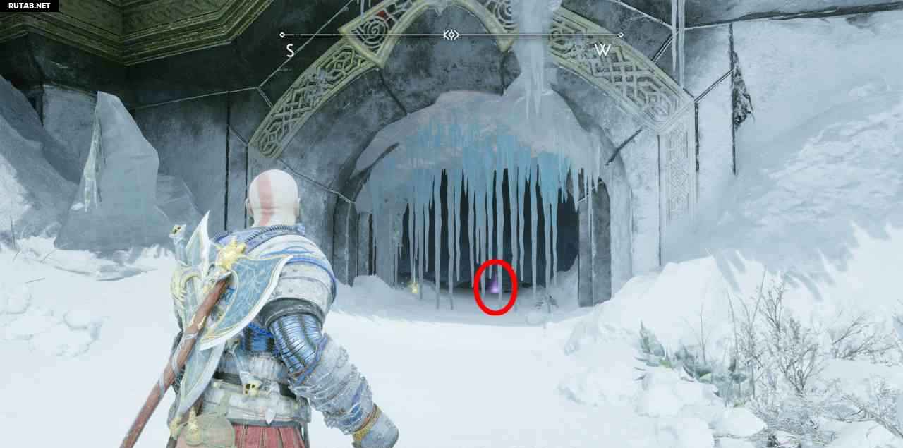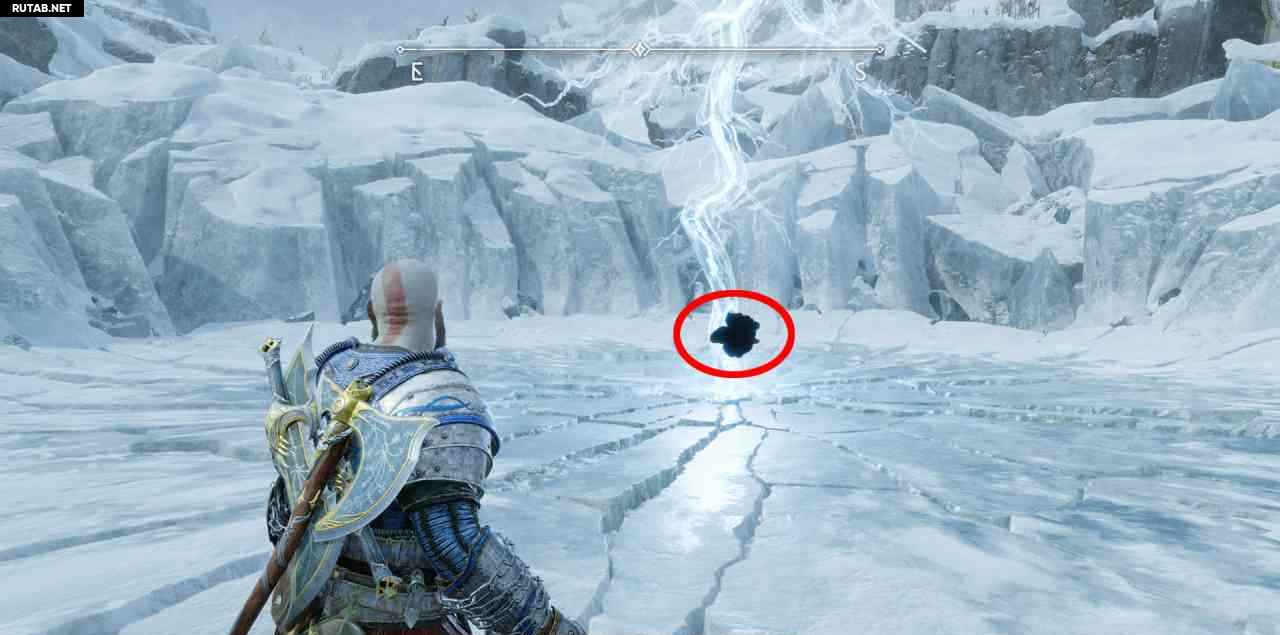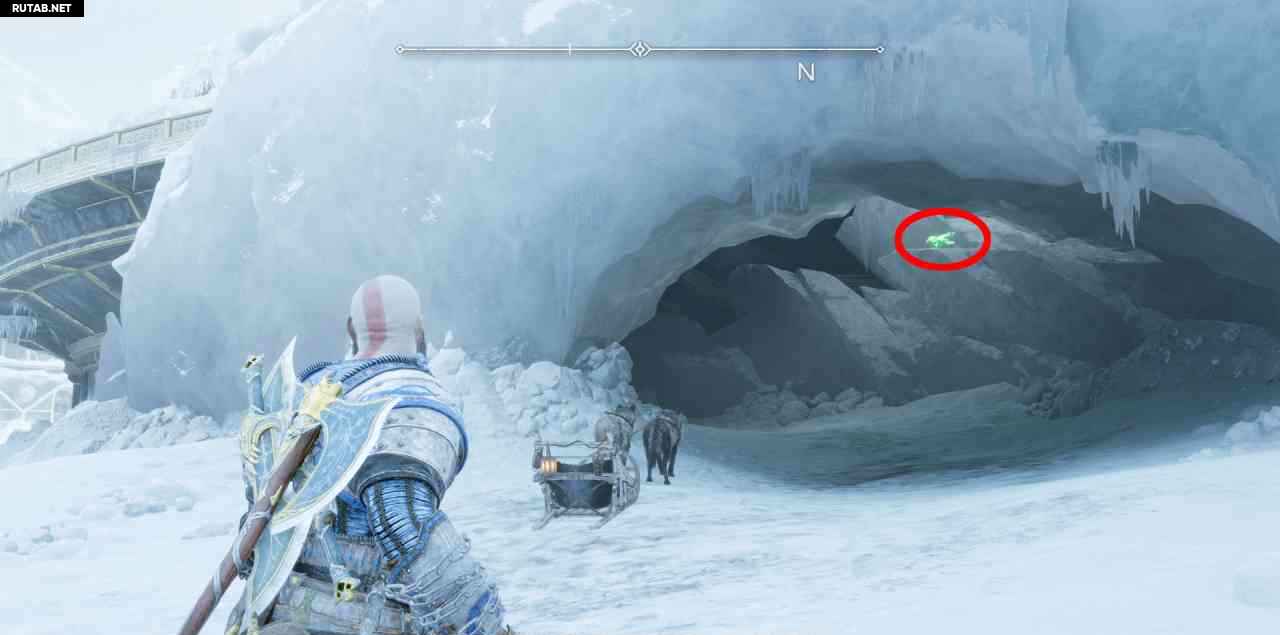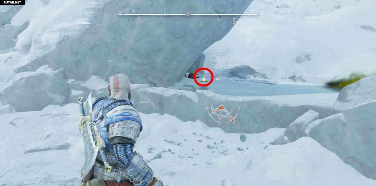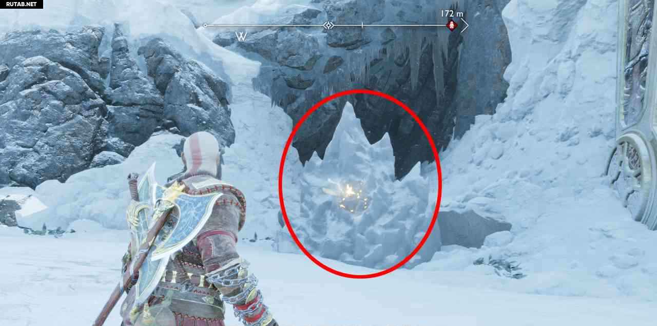 К юго-западу от ворона, за желтым светящимся куском льда, который можно взорвать копьем.