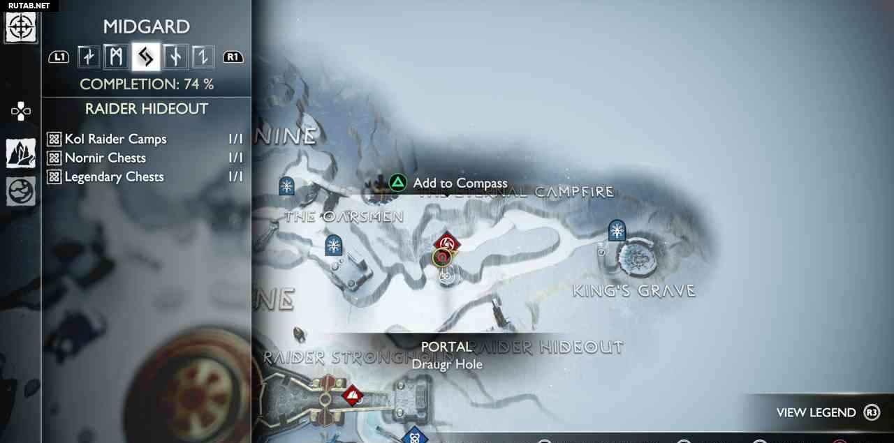 Ниже Ворона, справа от входа в убежище рейдеров. Чтобы сокровище появилось, вы должны сначала собрать карту сокровищ, она находится в свитке знаний, который можно найти в Мидгарде > Форт налетчиков. Вернитесь сюда после этого, сокровище будет светиться золотом на земле.