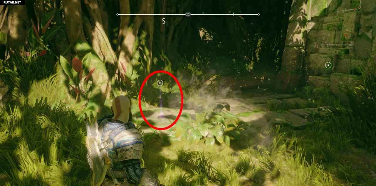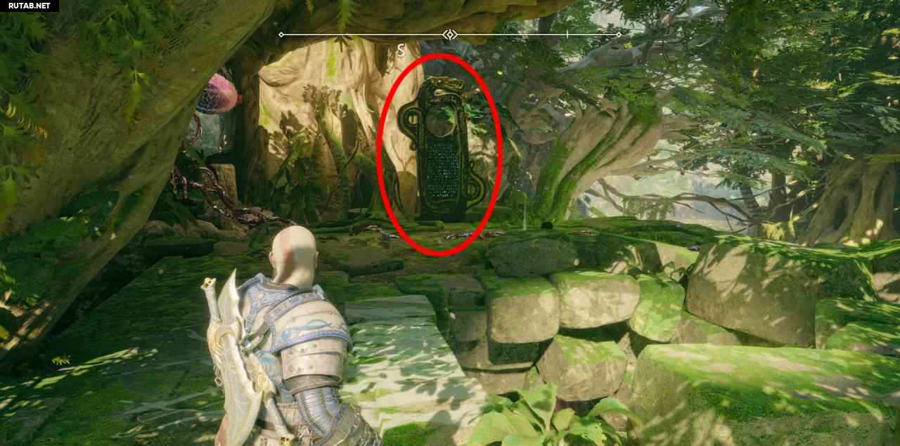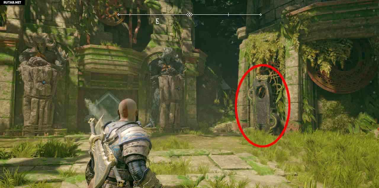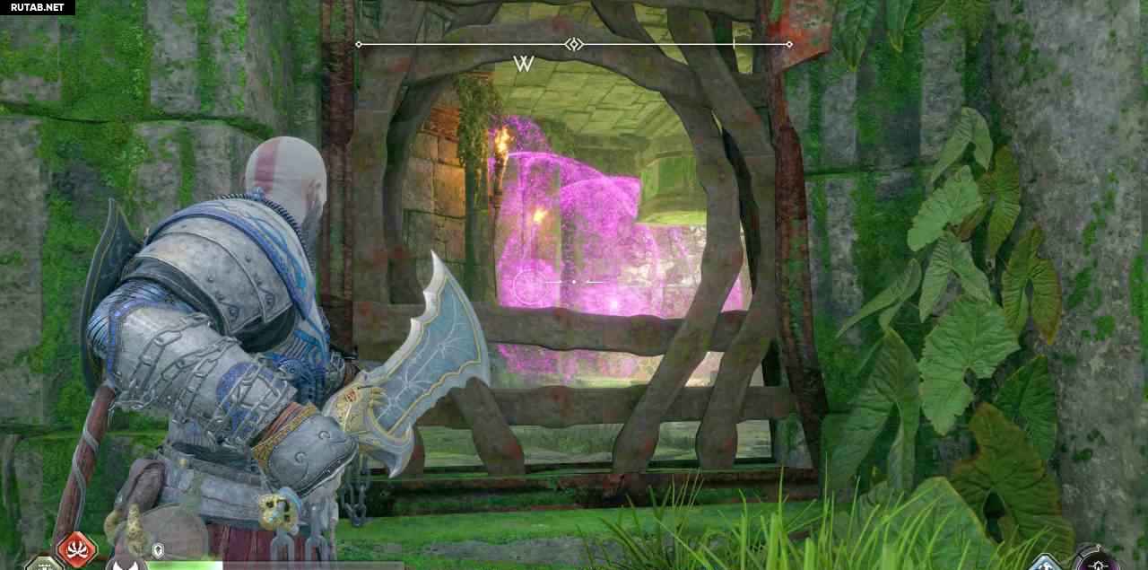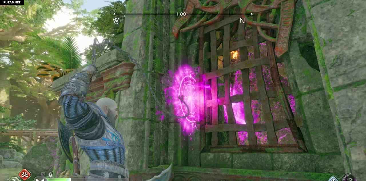От последней легендыповерните налево и посмотрите в "окно". Есть синий замок, заблокированный лианами. Разместите фиолетовые рунические стрелы вокруг лиан и выстрелите еще одной фиолетовой стрелой в стену снаружи, затем атакуйте Клинками Хаоса, чтобы вызвать взрыв, который заставит огонь перепрыгнуть на лианы. Затем вы можете бросить топор в синий замок.