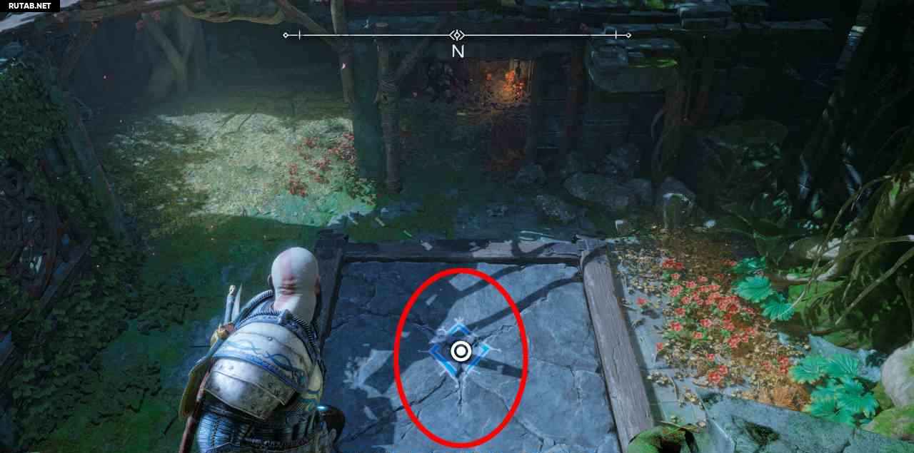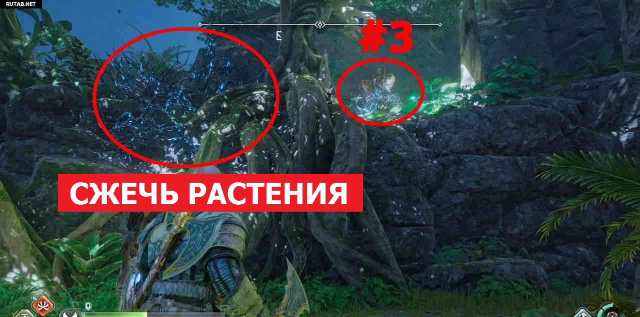 ). Третий находится напротив сундука, нужно сжечь лозы, свисающие с уступа, огонь распространится, затем вы можете бросить топор, чтобы повернуть символ. Когда вы повернете символы на правильные, вы увидите, что свет этого символа погаснет на самом Сундук Норн. Затем сундук можно открыть.