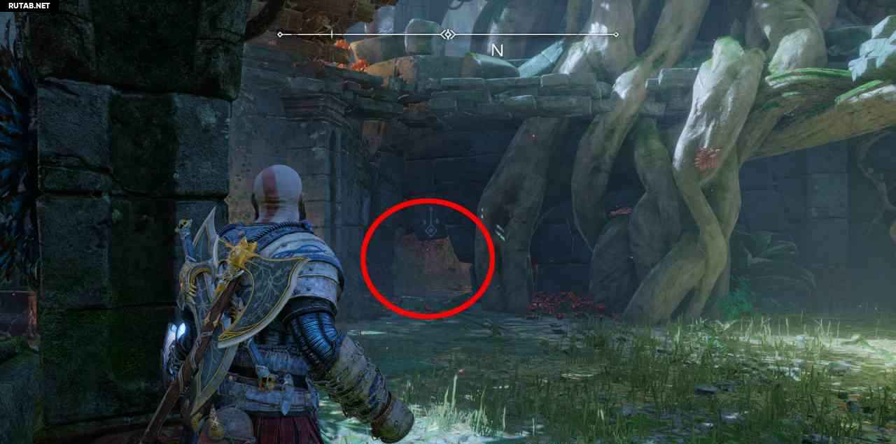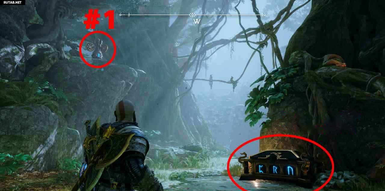Продолжайте идти по линейному пути, и вы доберетесь до Сундука Норн. Он посреди главной тропы, не пропустите. Вы должны повернуть 3 символа, бросив в них топор. Первый над сундуком слева. Второй находится справа от сундука, сначала нужно сжечь лозы своими Клинками Хаоса (