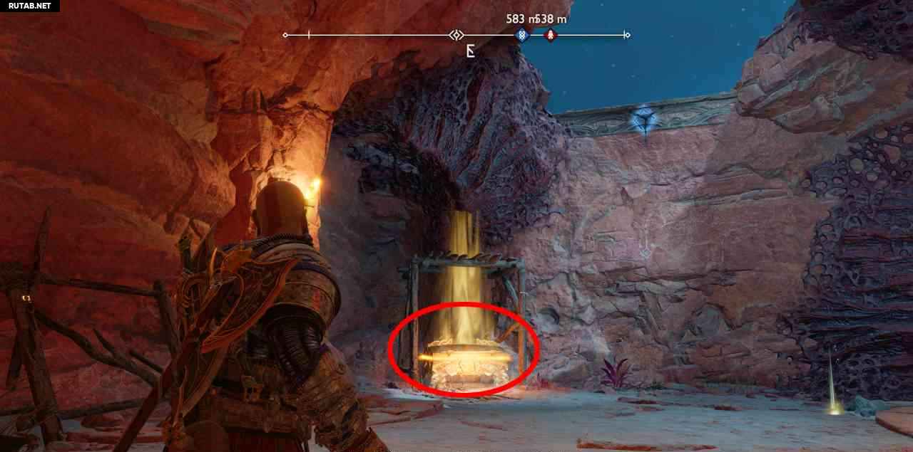 В «Подземелье» можно попасть, пройдя через Альфхейм > Стрёнд > Каньоны > Пустоши > Подземелье. Как только вы входите в пустоши, вы получаете Просьбу «Тайна песков», который приведет вас под землю в пещеру «Подземелье». В регионе есть линейный путь только с 3 предметами коллекционирования. Первый — Легенда. Это после 3 красных растений, которые вы сбиваете с топором. В комнате с темными эльфами, вы можете взобраться на стену и бросить свой топор в красные растения, чтобы открыть сундук с ресурсами и легенду.