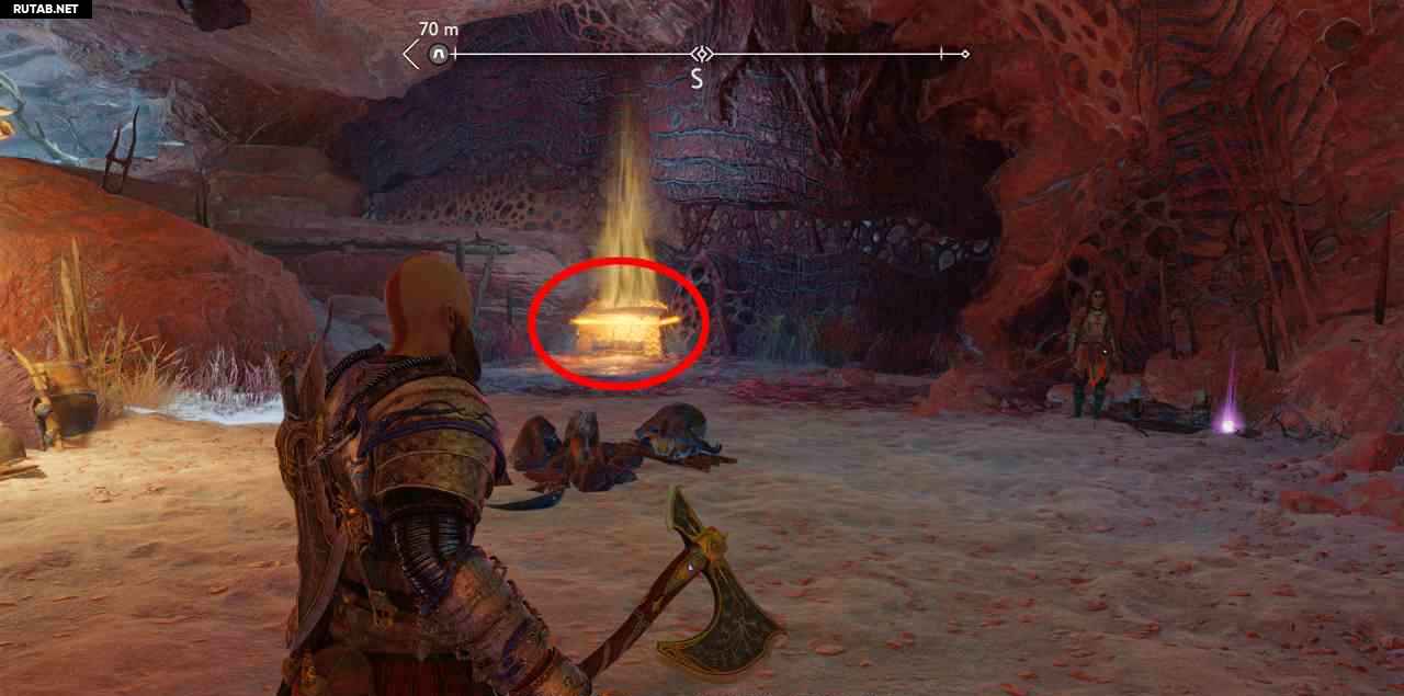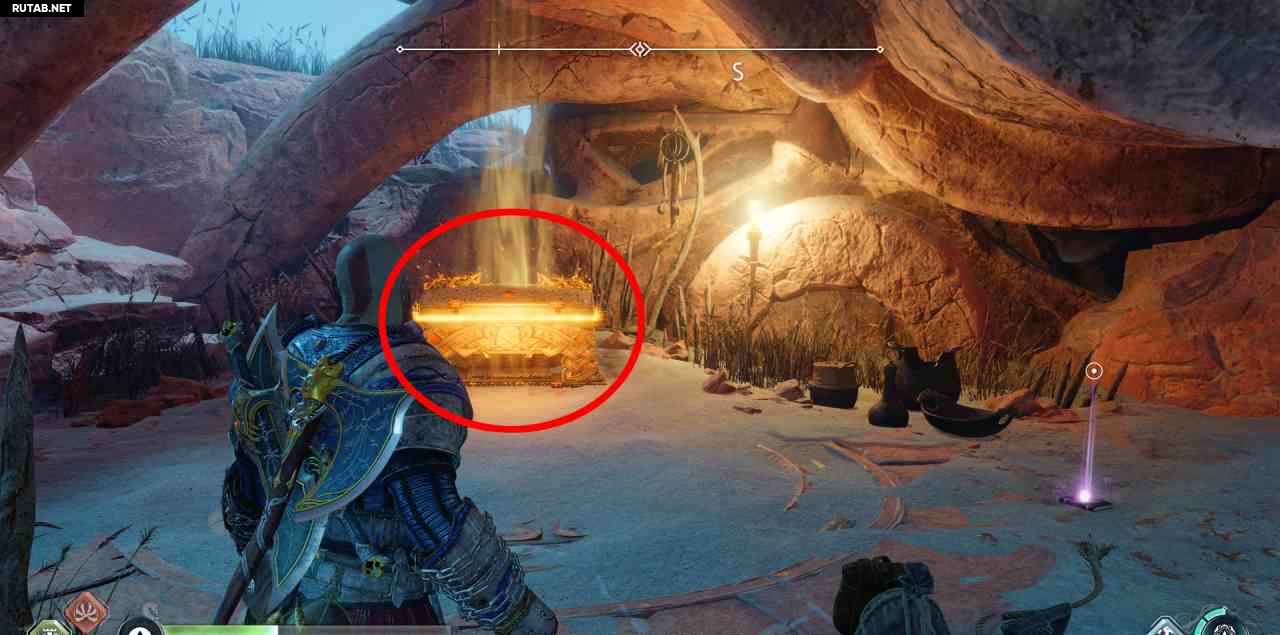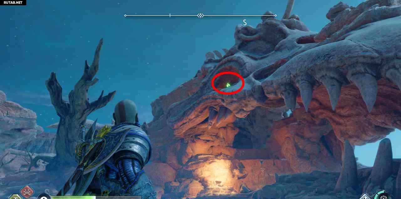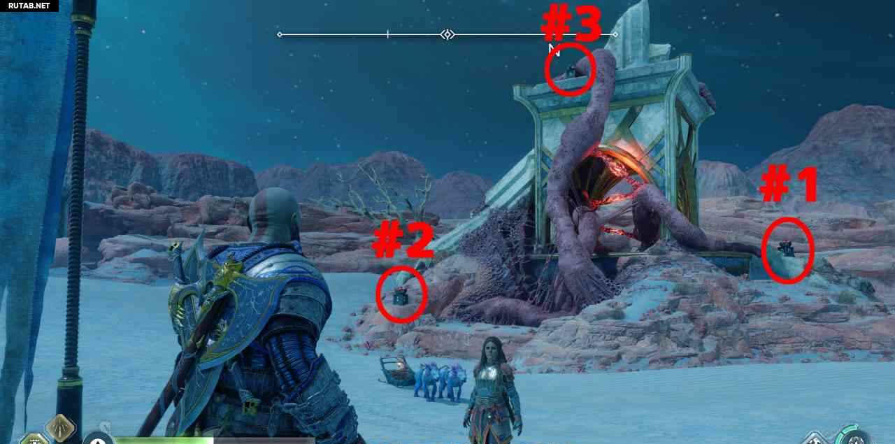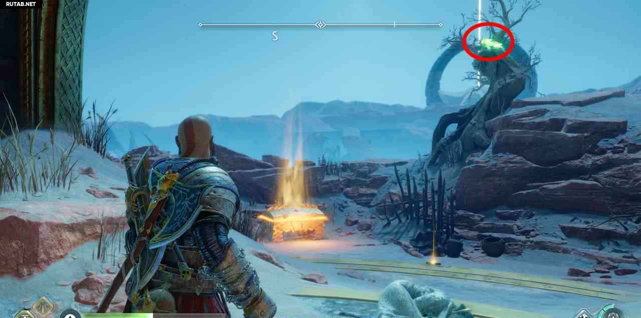 На севере, на скале. Сначала вы должны бросить свой топор через 3 красных светящихся мешка с северной стороны этой скалы (выровняйте их в одну линию, чтобы поразить все 3 одним броском). Затем подожгите 3 жаровни. Два рядом с землей, до них можно добраться с помощью Клинков Хаоса