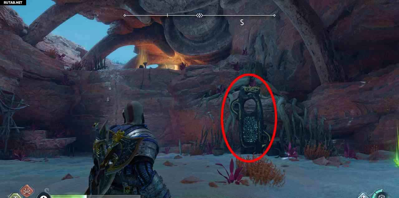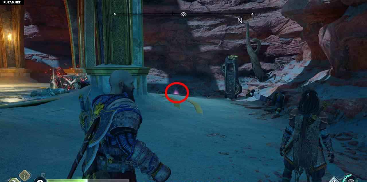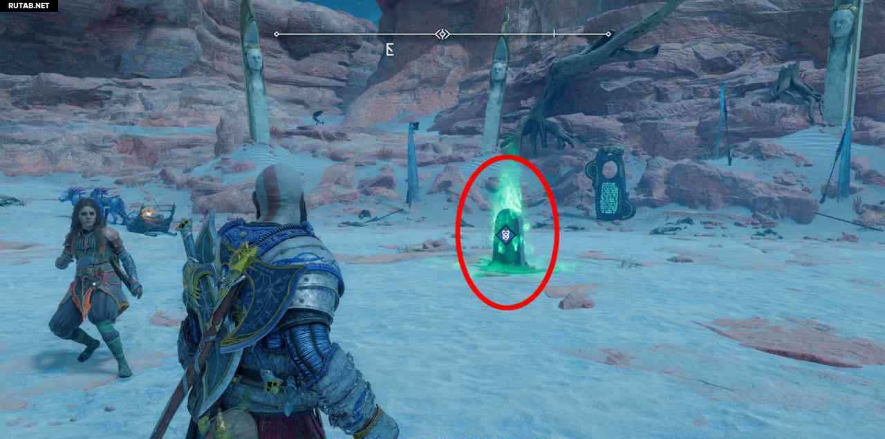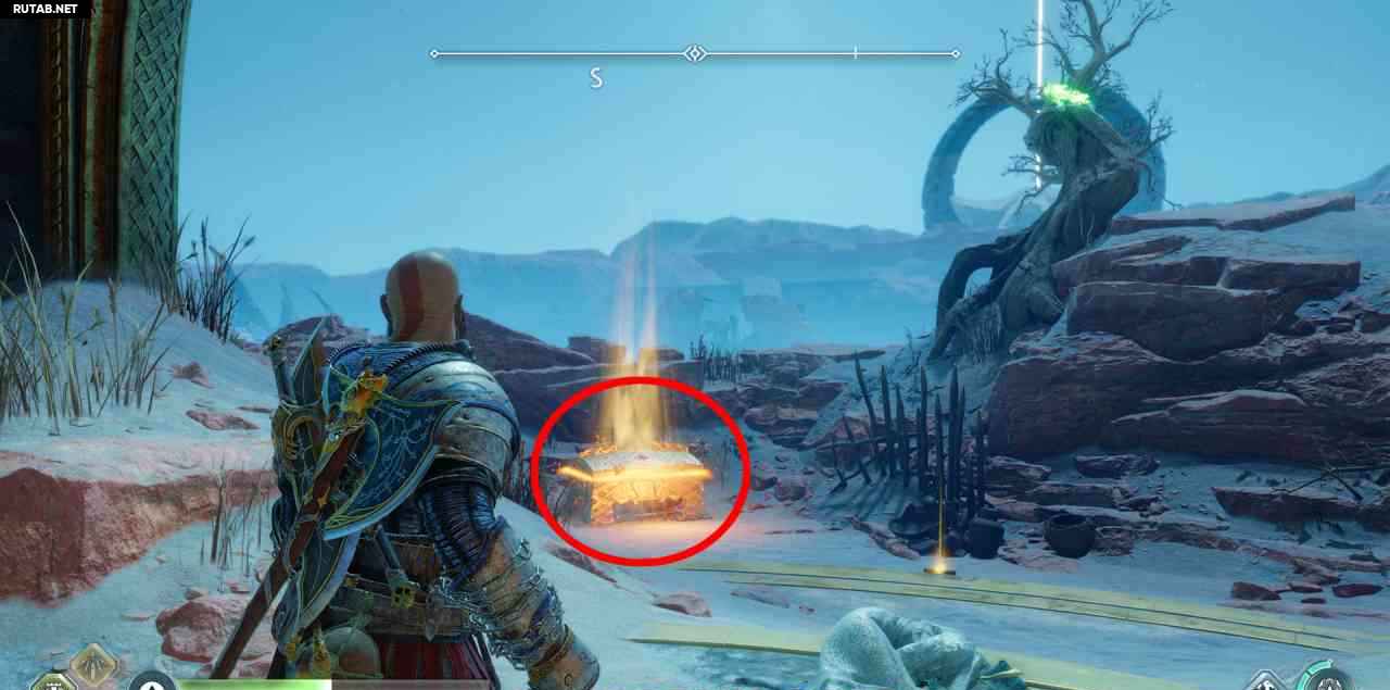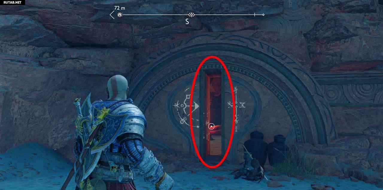 На севере, на скале. Сначала вы должны бросить свой топор через 3 красных светящихся мешка с северной стороны этой скалы (выровняйте их в одну линию, чтобы поразить все 3 одним броском). Затем подожгите 3 жаровни. Два рядом с землей, до них можно добраться с помощью Клинков Хаоса