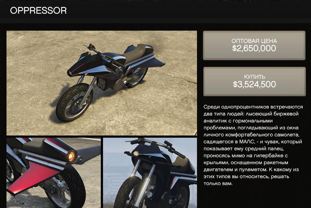 Покупка первого Opressor является одной из самых распространённых ошибок игроков GTA ONLINE. Банально потому, что Opressor сильно проигрывает своему младшему брату Opressor MK II. Ведь MK II способен летать, а не просто "далеко прыгать" как первый Opressor. Opressor MK II будет дороже всего на миллион, но достоинств явно больше.