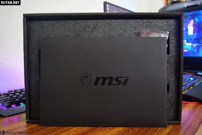 Внутри коробки черный конверт, на котором выгравирован логотип MSI. Он содержит аксессуары, а сама видеокарта скрыта за ним.