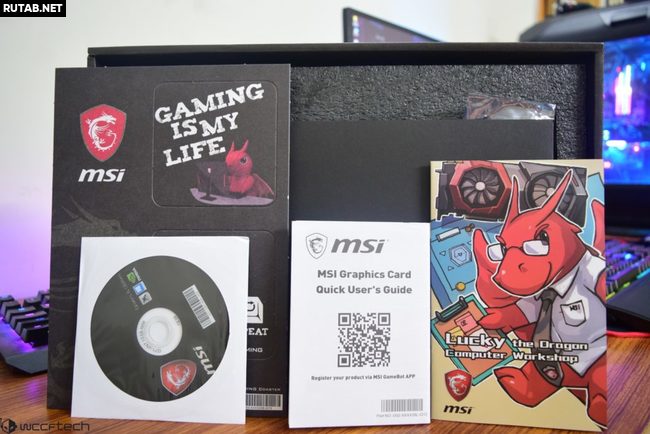 Полезные руководства и руководства по установке упакованы в фирменный чехол MSI. Существует краткое руководство пользователя MSI, руководство по установке кронштейна поддержки, письмо с наклейкой, комикс MSI DIY и диск с одним драйвером. Лучше игнорировать диск с драйверами и устанавливать последние версии программного обеспечения и графических драйверов непосредственно с официальных веб-страниц NVIDIA и MSI, поскольку те, которые поставляются на дисках, могут быть более старых версий и не обеспечивать оптимальную производительность для вашей видеокарты.