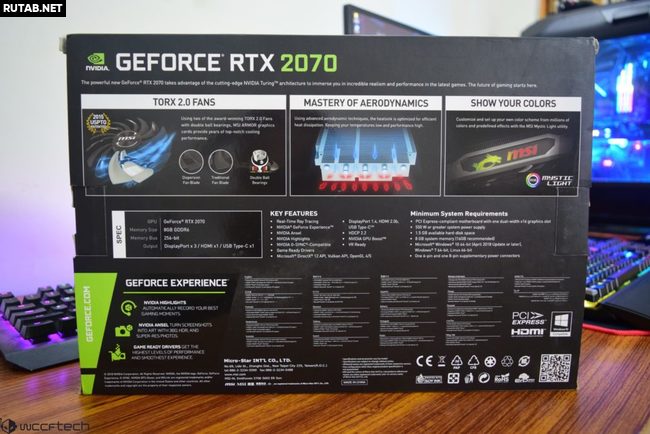 Задняя часть коробки типична, и подчеркивает основные характеристики видеокарты. Три ключевых аспекта пользовательских карт высшего уровня MSI - это конструкция вентилятора Torx 2.0, модернизированный и очень эффективный дизайн радиатора и поддержка Mystic Light RGB на боковой юбке карты.